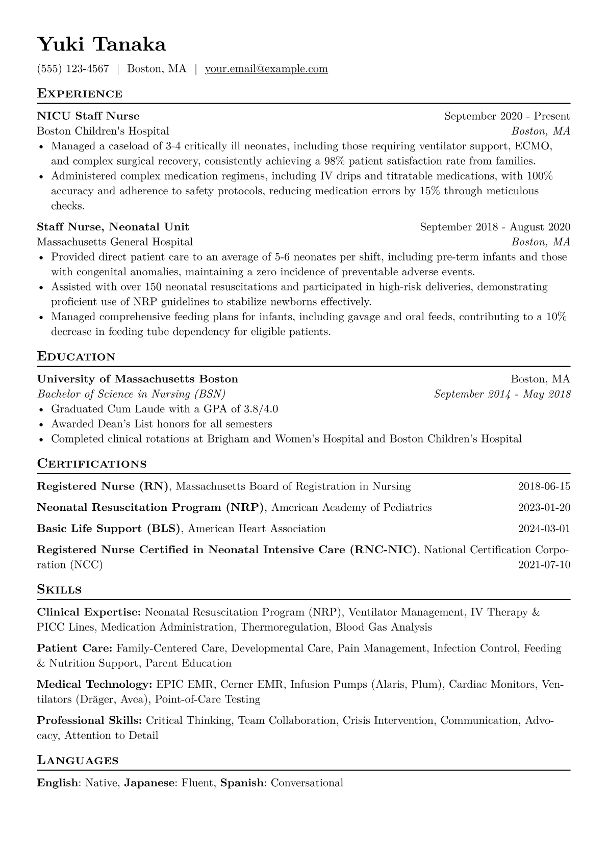 Crafting an impactful Neonatal Nurse resume requires showcasing exceptional clinical proficiency, empathy, and the ability to thrive in high-stakes environments. Hiring managers prioritize experience with critical care interventions, relevant certifications like NRP, and a proven track record in patient safety and family support. The unique challenge lies in conveying both precise technical skills and a compassionate approach to incredibly vulnerable patients.