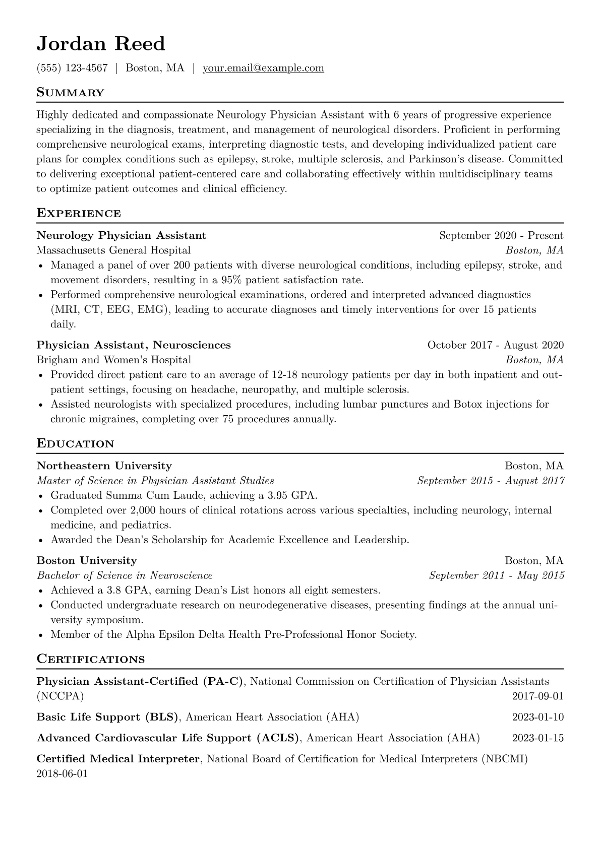 A compelling Neurology PA resume for a mid-level professional (3-7 years experience) must spotlight depth of clinical expertise and patient management skills. Hiring managers seek evidence of managing complex neurological conditions such as epilepsy, stroke, multiple sclerosis, or Parkinson's disease. Essential elements include quantifying experience with patient volume per clinic day, proficiency in diagnostic interpretation (e.g., MRI, EEG reports), and a clear understanding of neurological assessment techniques. Demonstrating expertise in relevant procedures like lumbar punctures or administering Botox for chronic migraines, alongside up-to-date NCCPA Board Certification and state licensure, is crucial for standing out.