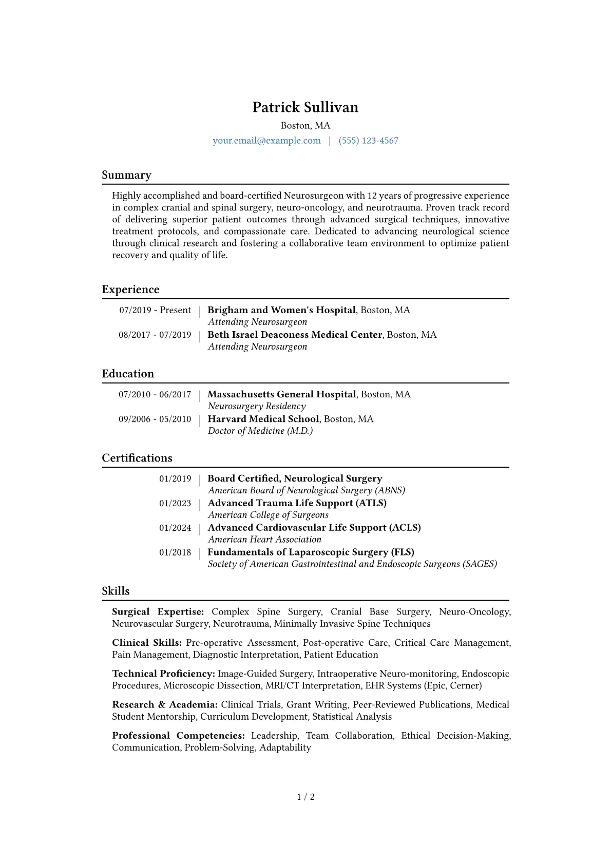 This template was built with JobSprout and can be remixed to create your own tailored Neurosurgeon resume, ensuring your qualifications are presented with the necessary precision and authority.