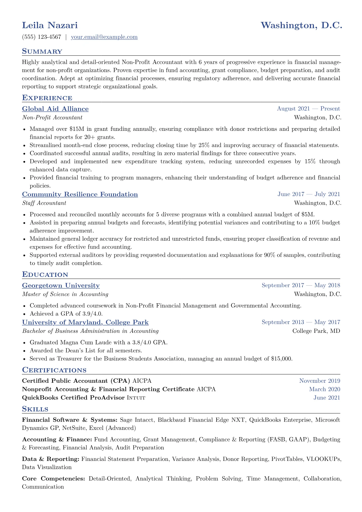 This template was built with JobSprout and can be remixed to create your own tailored Non-Profit Accountant resume, ensuring your qualifications align with industry expectations.