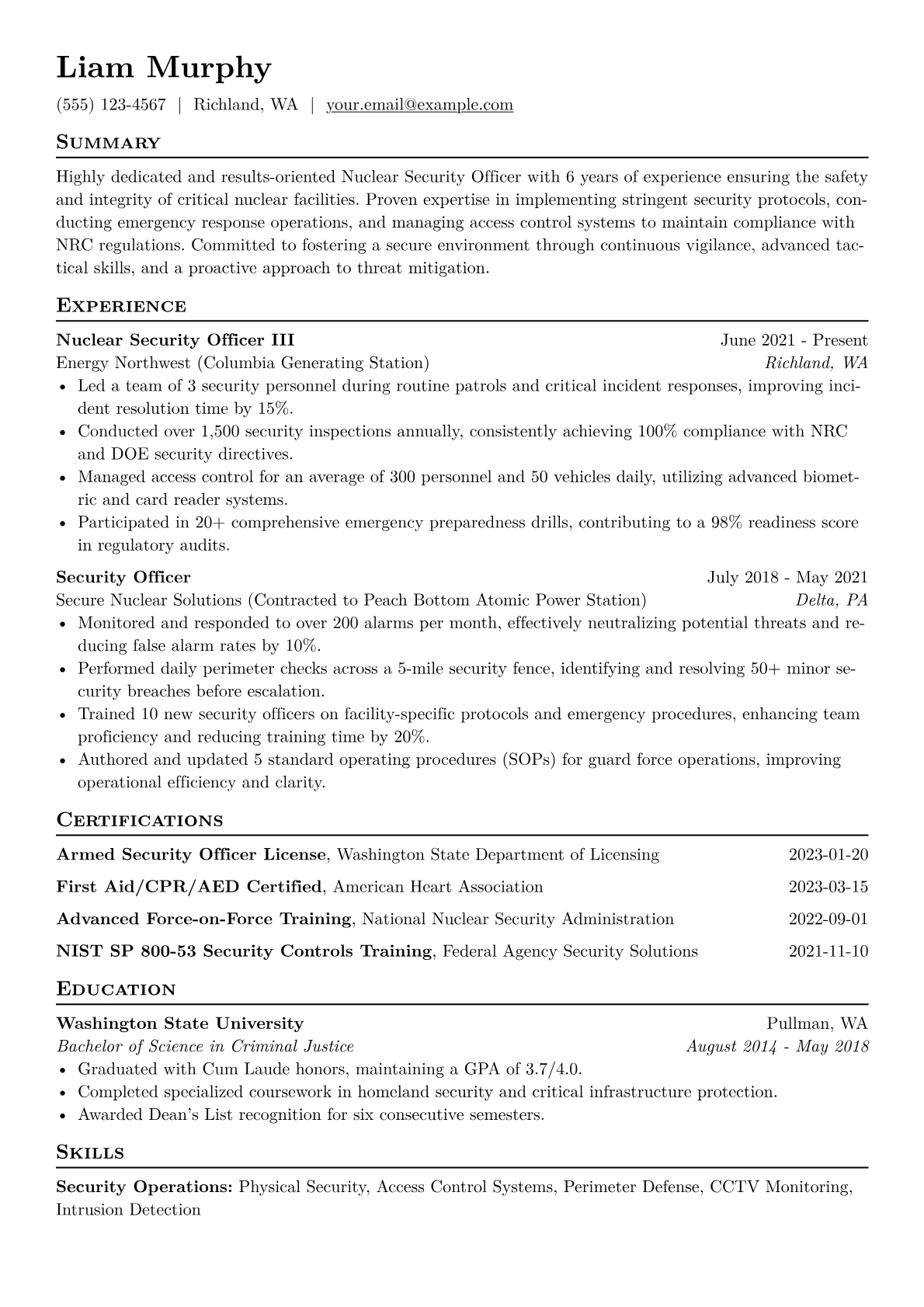 For a Nuclear Security Officer resume, hiring managers seek candidates who demonstrate rigorous adherence to regulatory frameworks like 10 CFR Part 73 and Department of Energy requirements. They look for achievements in maintaining physical security, responding to incidents, and successfully participating in force-on-force exercises. Concrete experience with access control systems, alarm monitoring, and firearms proficiency is essential. Certifications such as NTC Basic Security Officer, relevant security clearances like an L or Q clearance, and specialized training in areas like tactical response or HAZMAT are critical indicators of readiness and capability in this highly sensitive field.