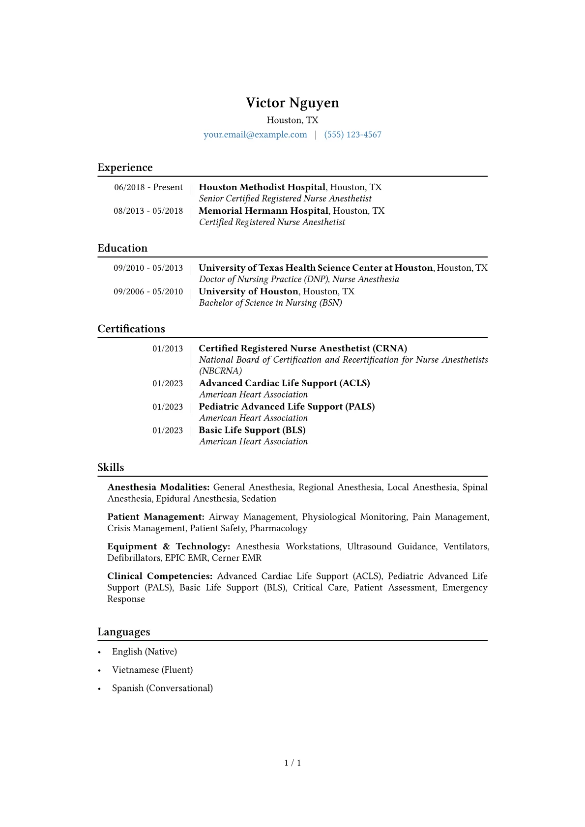 This example CV effectively showcases these critical elements. It quantifies achievements with metrics like "Managed over 500 complex cardiac cases annually" and "Reduced post-operative opioid use by 15%," clearly demonstrating impact. Clinical skills are precisely grouped, distinguishing expertise in areas like advanced airway management, central line placement, and specific EMR systems such as Epic or Cerner. Crucially, required certifications are prominently displayed with their relevant dates, reassuring hiring teams of current qualifications and compliance.