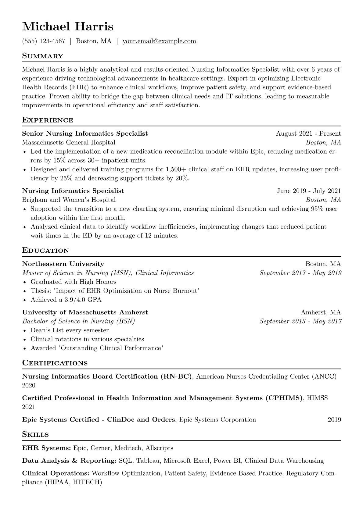 The example resume effectively showcases these critical elements, making it an excellent guide. It strategically groups skills under headings like "EHR Implementation" and "Data Analytics," clearly defining the candidate's technical scope. Achievements are consistently quantified, for instance, detailing a "15% reduction in charting time" or "successful implementation of a new patient portal serving 10,000 users." This structure allows hiring managers to quickly grasp the impact of the candidate's work. Specific certifications and proficiency with tools like Epic, Tableau, and SQL are prominently featured, directly addressing industry demands for relevant, actionable expertise.