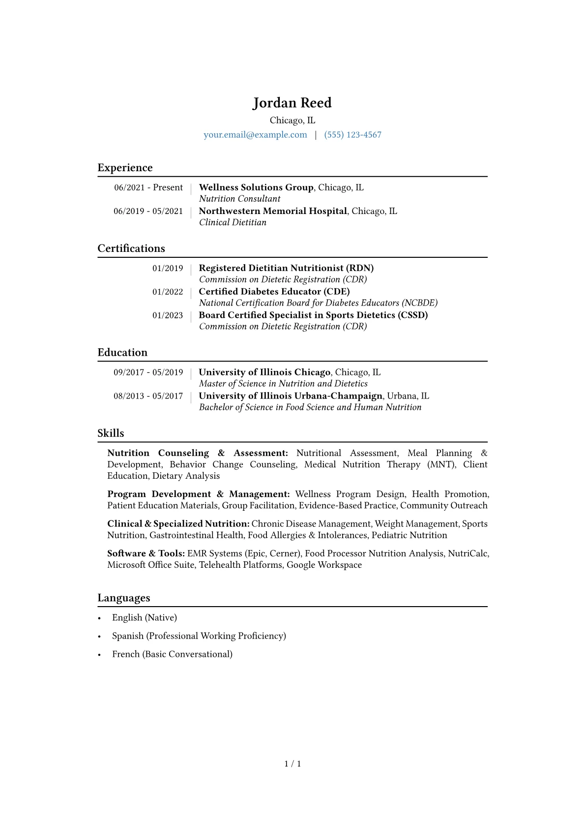 This effective template was built with JobSprout's intuitive platform and can be easily remixed to craft your own compelling Nutrition Consultant resume.
