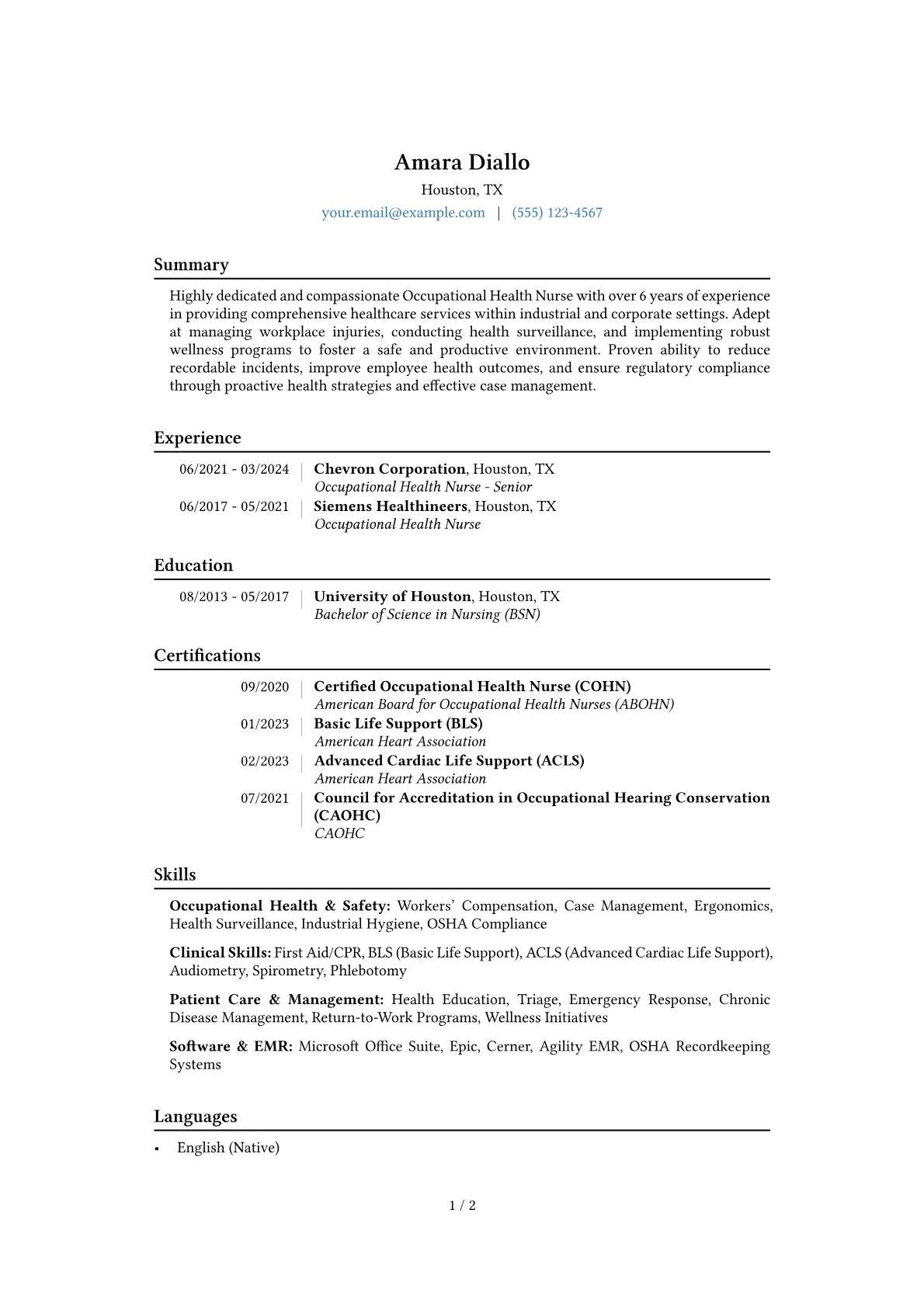 This example resume effectively showcases these critical components. Achievements are clearly quantified, such as "Managed over 50 complex workers' compensation cases, facilitating timely return-to-work plans" or "Implemented wellness initiatives that increased employee participation by 20%." Skills are thoughtfully grouped into categories like Clinical Expertise, Regulatory Compliance, and Health Promotion, providing a comprehensive overview. Important certifications and proficiency with specific EMR systems or diagnostic tools like audiometry are distinctly highlighted, emphasizing job-specific competencies.