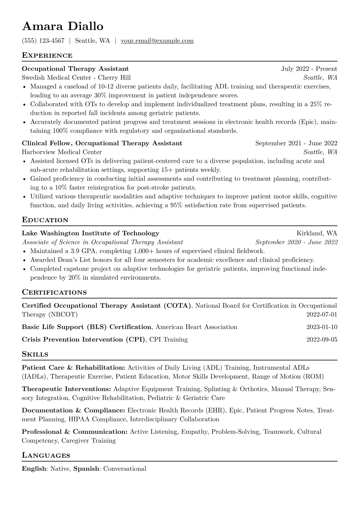 This powerful template was built with JobSprout, offering a robust foundation that you can easily remix to create your own compelling Occupational Therapy Assistant resume.
