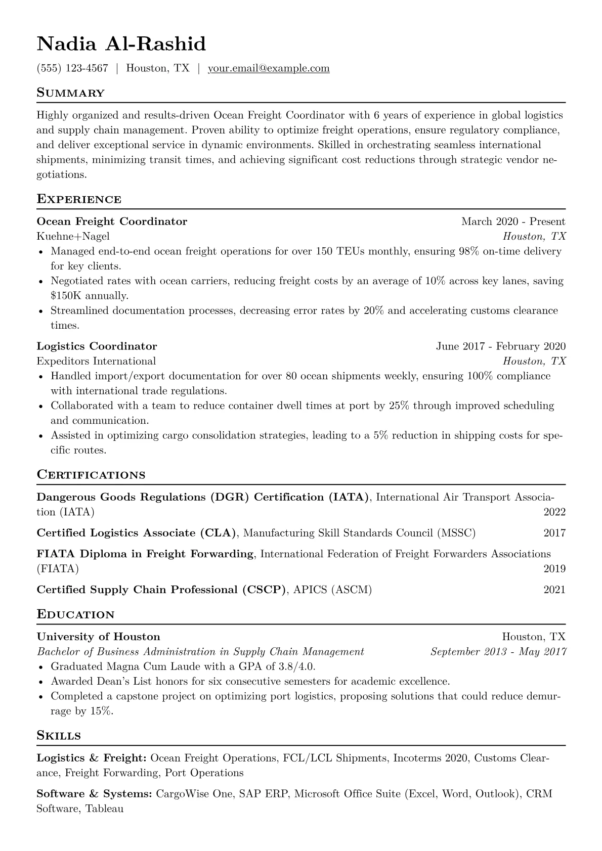 This example CV effectively showcases an Ocean Freight Coordinator's capabilities. Achievements are quantified clearly, for instance, by detailing specific percentage reductions in transit times or volumes of freight managed monthly. Skills are thoughtfully grouped into categories like "Logistics Software" (e.g., CargoWise One, INTTRA) and "Regulatory Compliance" (Incoterms 2020), providing immediate clarity on core competencies. Certifications, such as hazmat endorsements or specialized customs training, are prominently highlighted, reinforcing a commitment to professional standards.