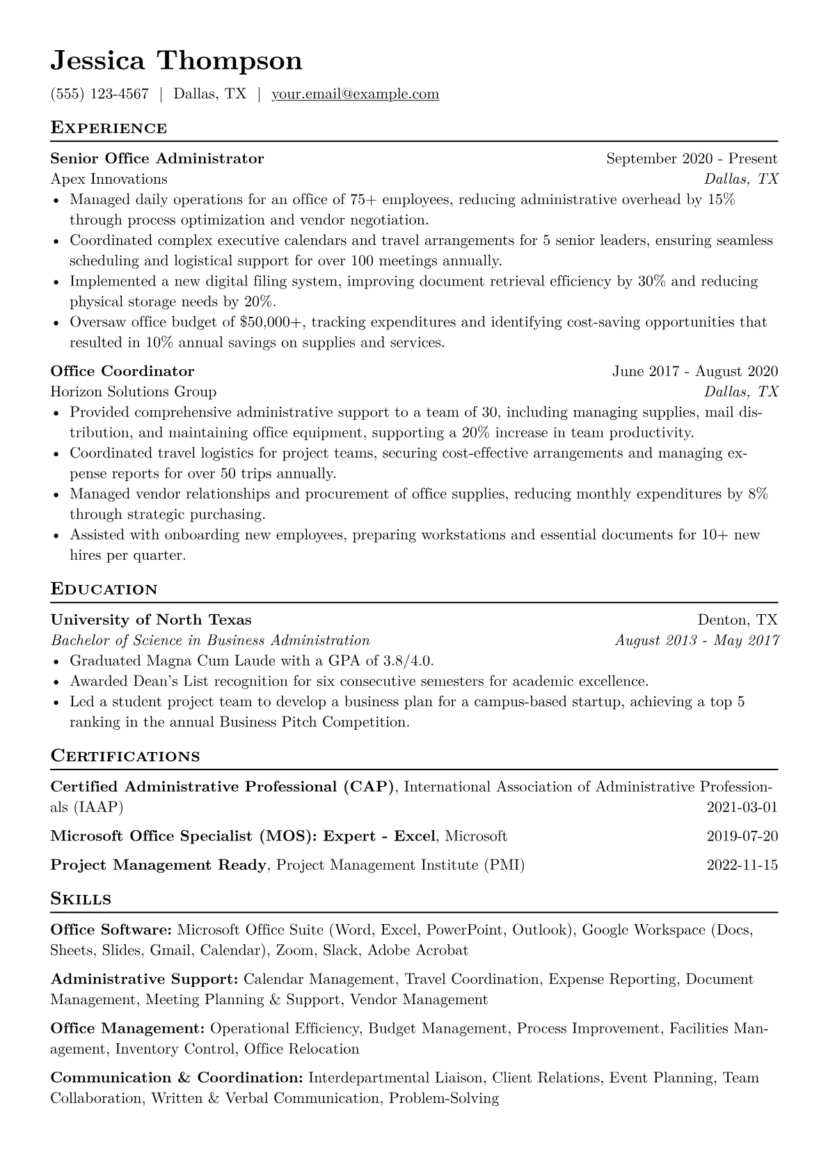 This example excels by highlighting quantified achievements, such as process improvements and cost savings, immediately illustrating impact. Its clear skills grouping, separating administrative, operational, and software proficiencies, makes the candidate's diverse capabilities easily digestible. The inclusion of relevant certifications further validates expertise, assuring recruiters of a candidate's readiness to support multifaceted organizational demands.