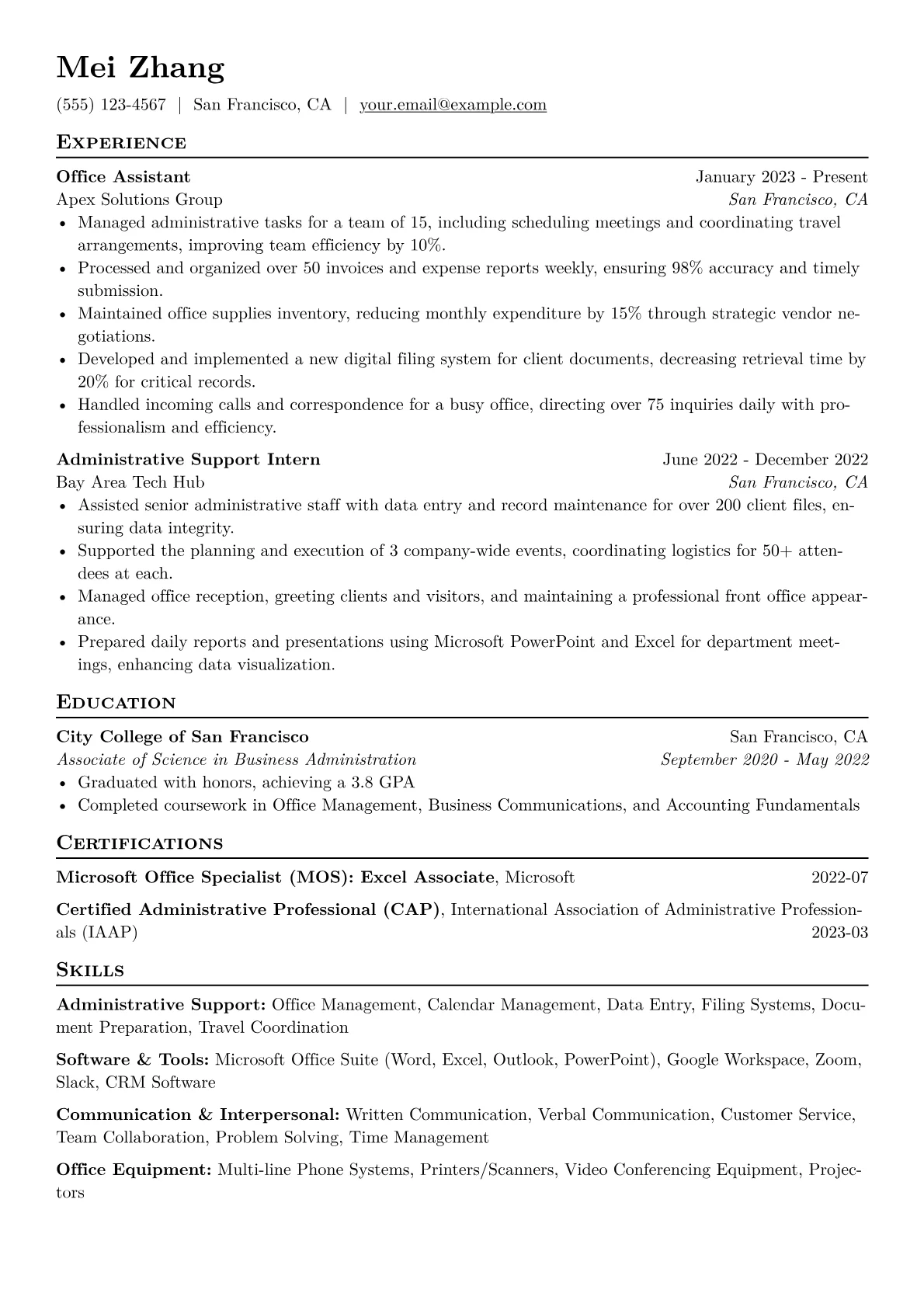An effective Office Assistant resume, particularly for entry-level roles in varied professional settings, clearly demonstrates excellent organizational skills, strong communication abilities, and a proactive work ethic. Hiring managers in less specialized industries seek candidates who are reliable, adaptable, and possess foundational technical proficiency and a keen eye for detail, often needing to infer these from limited direct experience. The challenge lies in showcasing these essential soft and hard skills without extensive prior administrative roles.