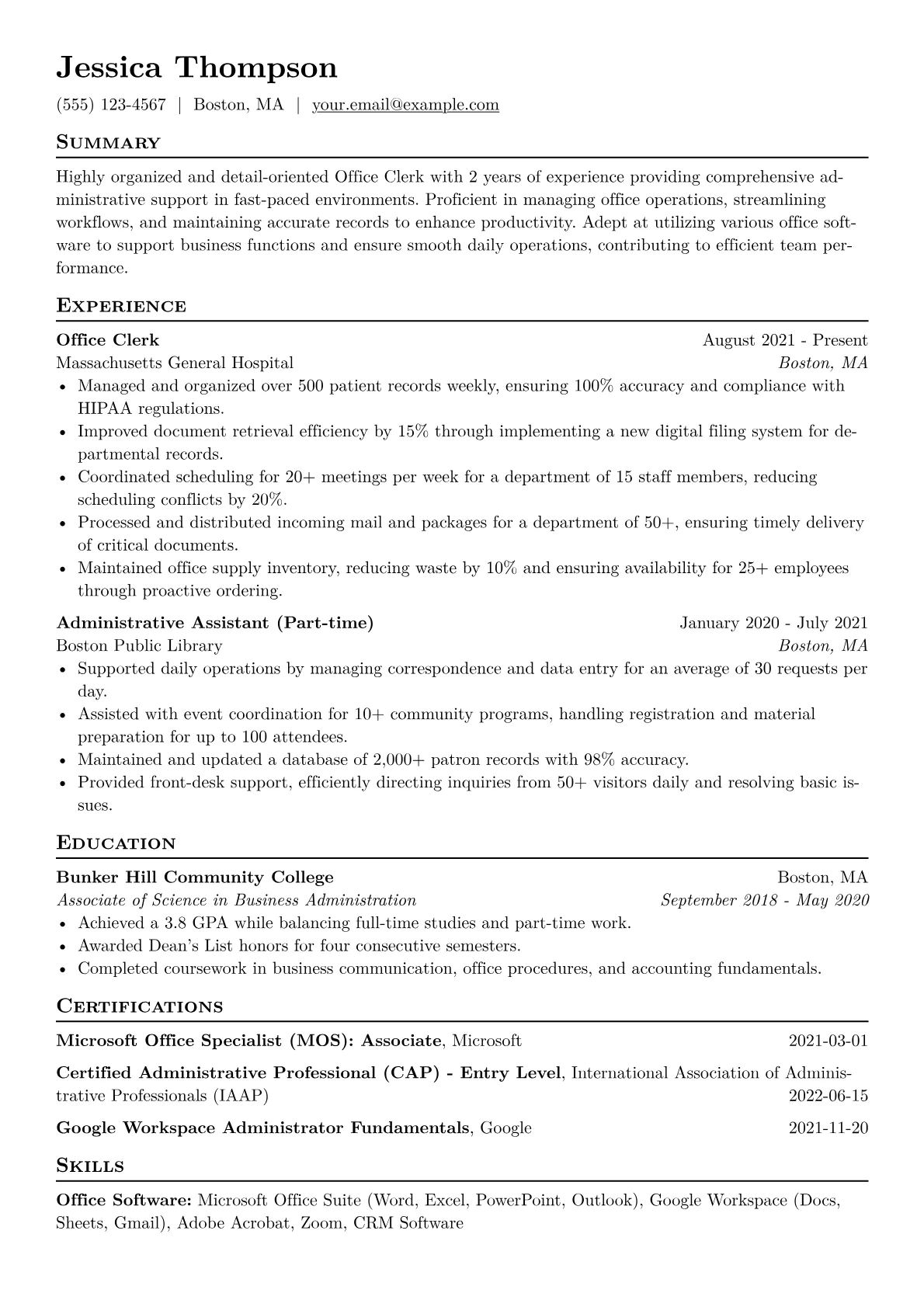 This example CV effectively highlights an Office Clerk's core competencies by presenting achievements with measurable impact. For instance, tasks like managing incoming correspondence or updating client databases are quantified, illustrating efficiency and accuracy rather than just listing duties. Skills are clearly grouped under relevant headings such as "Administrative Support" and "Technical Proficiency," ensuring immediate visibility for key areas. Specific software tools like Google Workspace, QuickBooks, or internal CRM systems are prominently featured, demonstrating readiness for modern office environments.