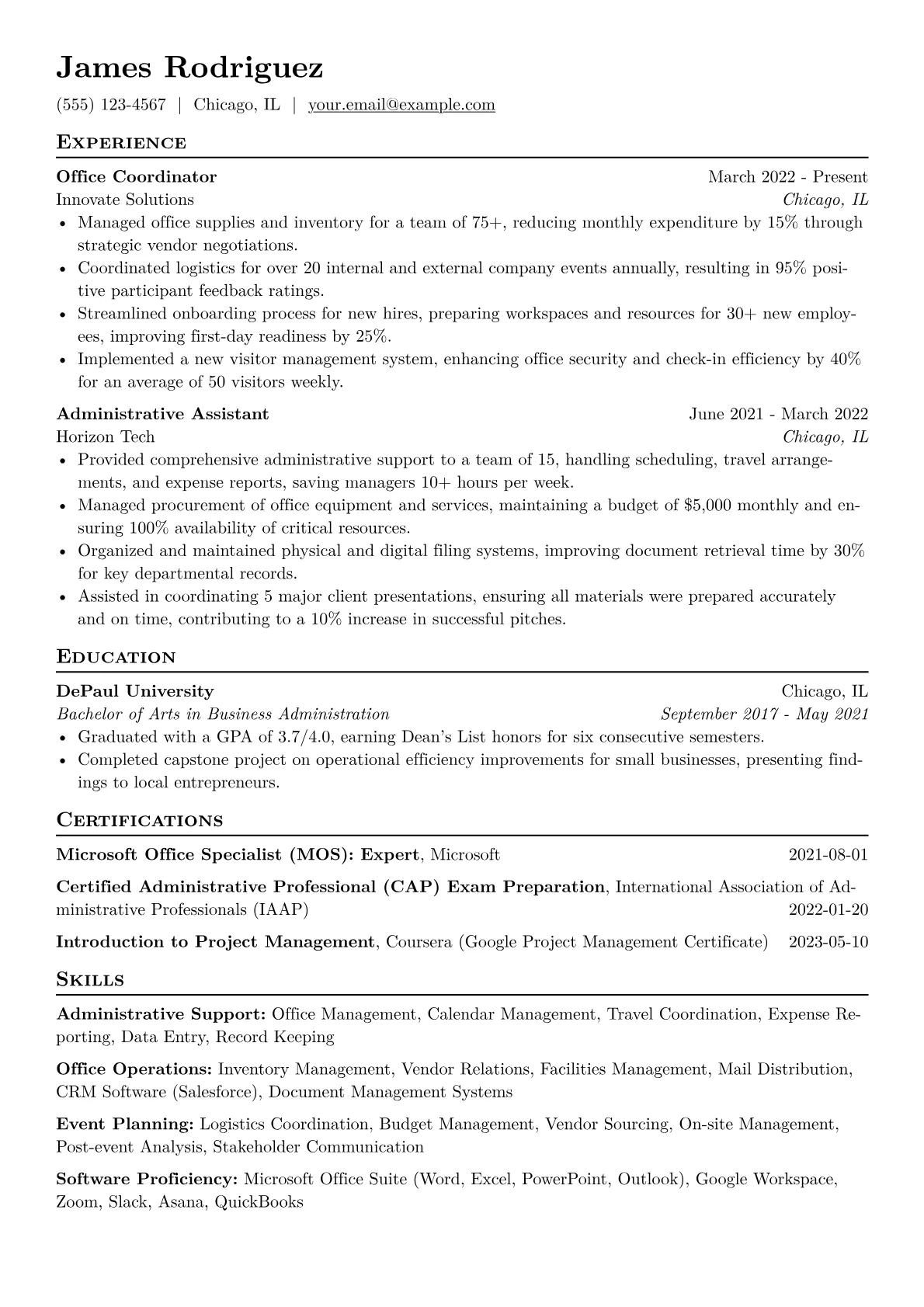 A strong Office Coordinator resume, particularly for entry-level roles in diverse industries, highlights exceptional organizational skills, clear communication, and a proactive attitude. Hiring managers seek candidates who demonstrate the ability to manage varied tasks, support multiple teams, and maintain an efficient office environment, often being the first point of contact. The unique challenge lies in showcasing adaptability and problem-solving abilities across a range of daily administrative duties.