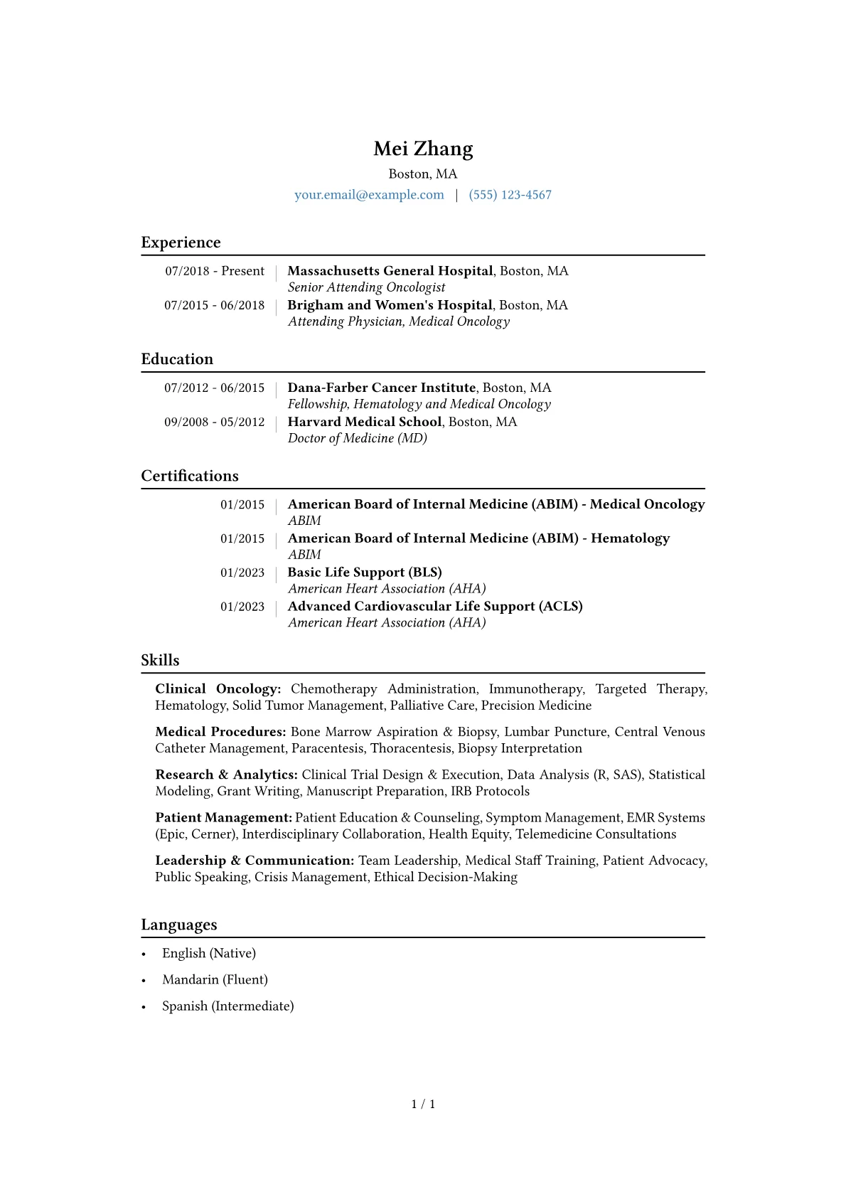 The example CV excels by structuring an Oncologist's extensive experience with clarity and impact. Achievements are precisely quantified, detailing success in patient care metrics, such as reducing readmission rates by a specific percentage, or the scope of research impact, like securing competitive grants. Clinical skills are thoughtfully grouped with technical proficiencies in EMR systems such as Epic or Cerner, while essential certifications like state medical licenses and ACLS are prominently displayed, assuring compliance and readiness.