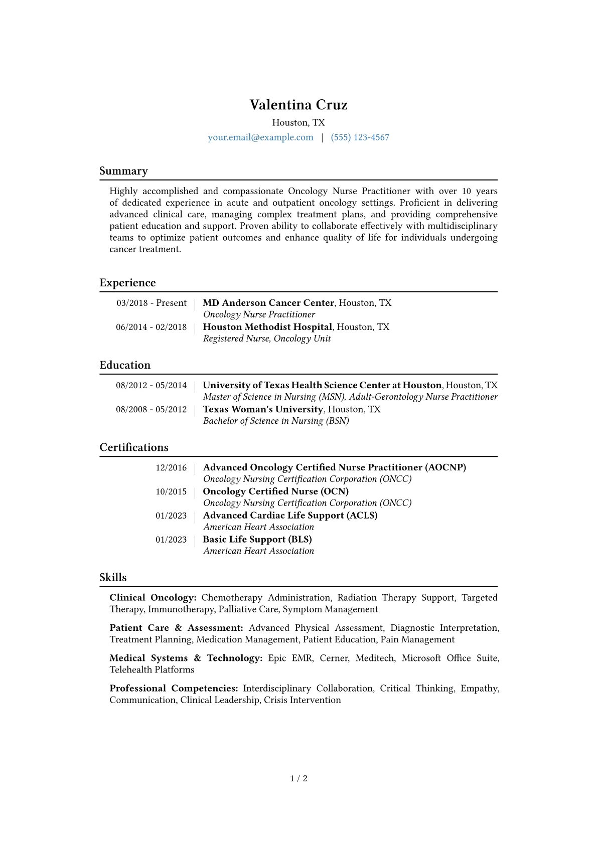 The JobSprout example skillfully illustrates these points. It effectively quantifies achievements, such as detailing the number of patients managed or the percentage improvement in patient satisfaction scores post-intervention. Clinical and technical skills are grouped logically, immediately showcasing proficiencies in chemotherapy administration, advanced assessment, and EMR systems. Crucially, relevant certifications like AOCNP or BLS are prominently featured, assuring immediate recognition of a highly qualified professional. This structural clarity allows recruiters to quickly identify key competencies vital for a senior oncology role.