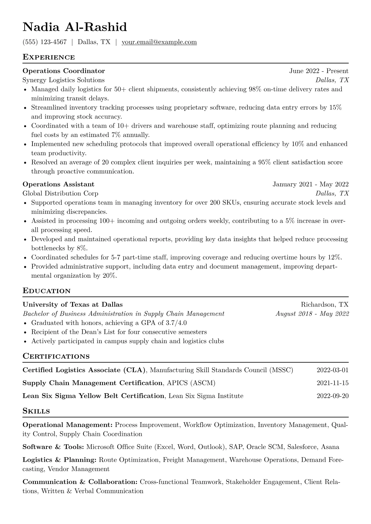A strong Operations Coordinator resume for entry-level roles in diverse industries emphasizes organizational prowess, problem-solving capabilities, and a keen eye for detail. Hiring managers seek candidates who demonstrate an ability to streamline processes, communicate effectively, and maintain operational efficiency, often navigating unforeseen challenges with a proactive approach. Highlighting adaptability and a readiness to learn is crucial for those with limited experience.