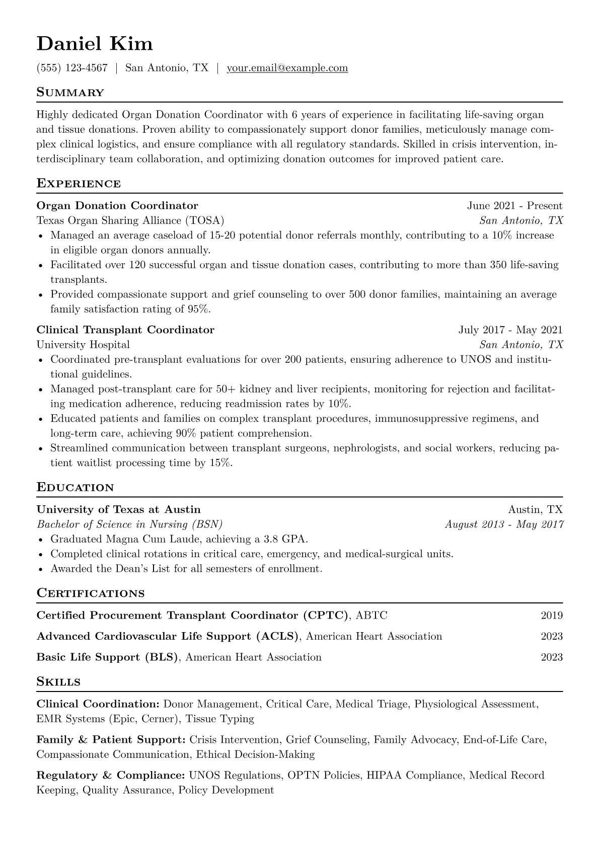 This template was built with JobSprout and can be remixed to create your own tailored Organ Donation Coordinator resume.