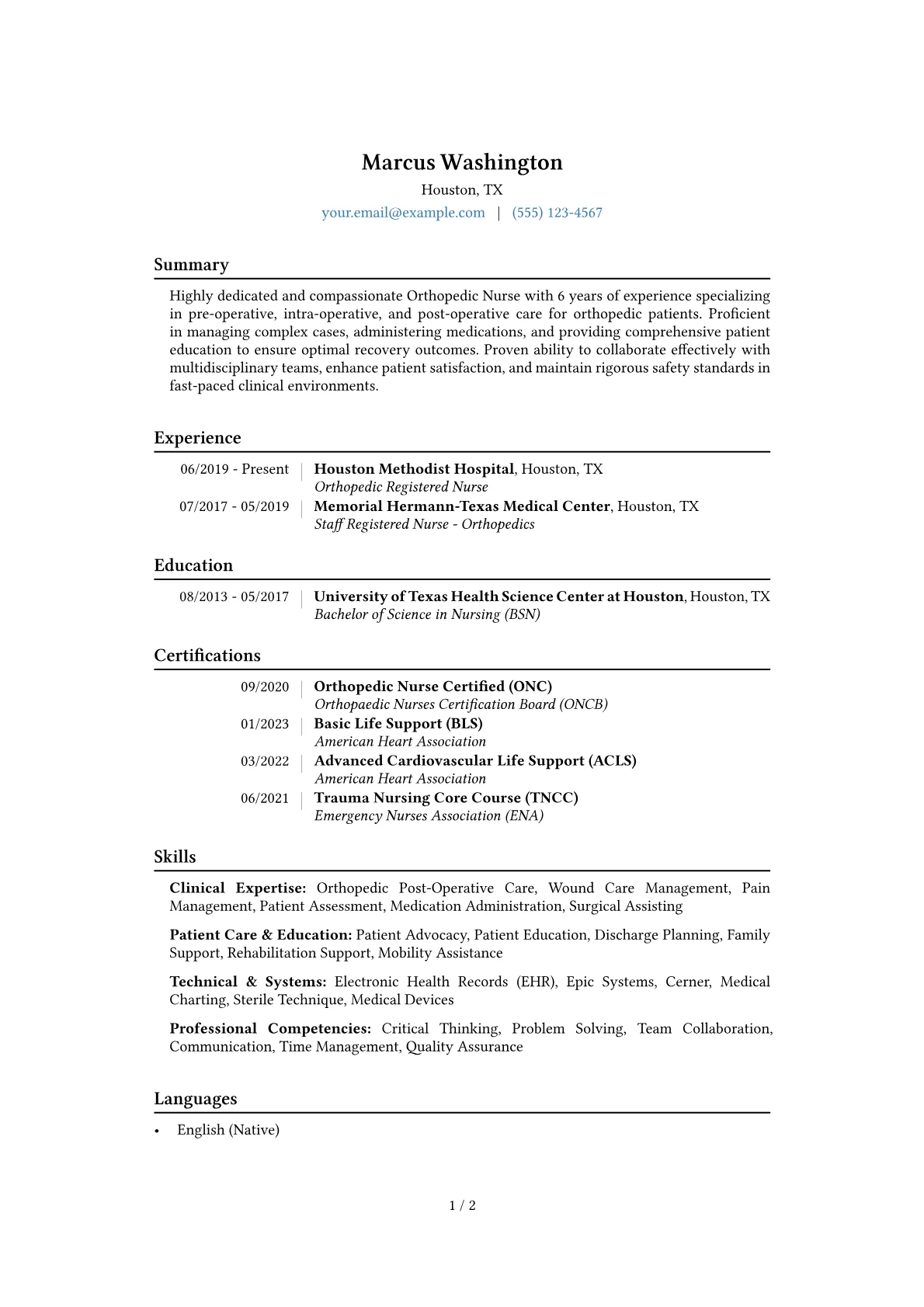 This template was built with JobSprout and can be remixed to create your own tailored Orthopedic Nurse resume, ensuring you present your qualifications effectively.