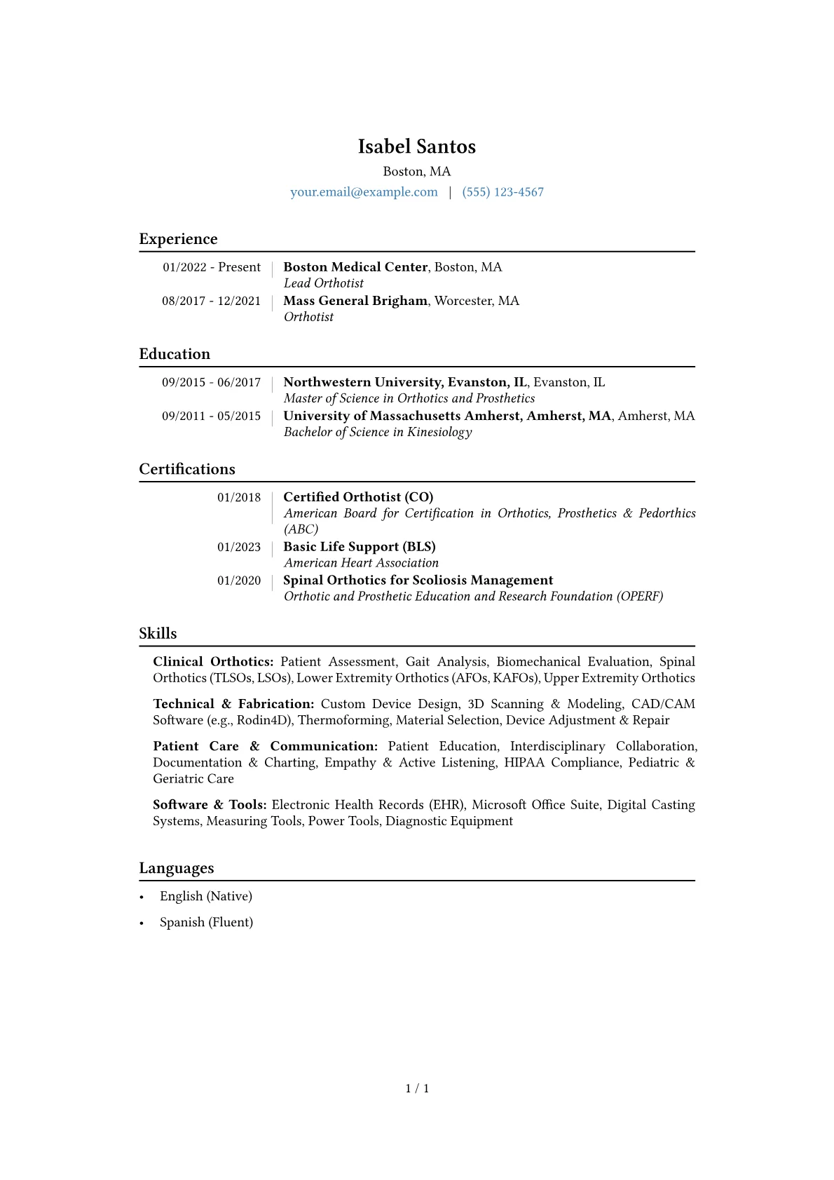 A strong Orthotist resume clearly highlights expertise in patient assessment, custom device fabrication, and post-fitting care. Hiring managers in healthcare seek candidates who demonstrate excellent clinical judgment, adhere to regulatory standards, and prioritize patient outcomes. A key challenge is effectively showcasing both precise technical skills and empathetic patient communication.