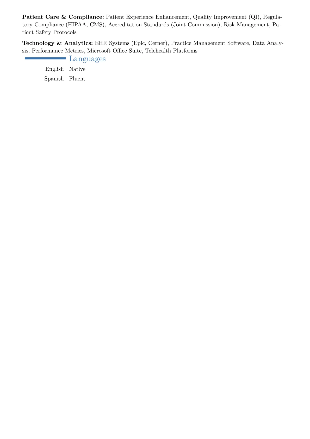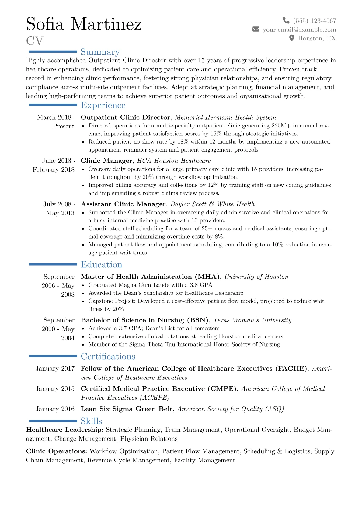 This example resume effectively structures an executive's extensive experience. Achievements are clearly quantified, using percentages and specific figures to illustrate impact on operational efficiency, patient satisfaction, and financial performance. Skills are strategically grouped into categories like "Operational Leadership," "Clinical Oversight," and "Financial Management," providing a quick overview of capabilities. Crucial certifications such as FACHE or Lean Six Sigma, along with proficiency in relevant EMR platforms, are prominently displayed, reinforcing the candidate's industry-specific qualifications.