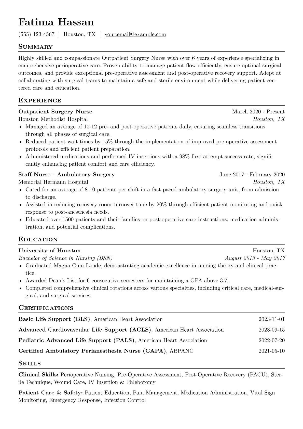 This example Outpatient Surgery Nurse resume effectively showcases these vital attributes. It precisely quantifies achievements, such as "Managed an average of 15 surgical cases daily across multiple specialties" or "Streamlined pre-operative intake, reducing patient wait times by 10%." Critical clinical skills like IV access, medication administration, and sterile technique are distinctly grouped, making key competencies immediately clear. Furthermore, the template prominently features relevant certifications like ACLS and PALS, alongside specific EMR proficiencies, ensuring these qualifications are not overlooked. The structure prioritizes impact, reflecting the nurse's direct contributions to patient outcomes and operational efficiency within an outpatient setting.