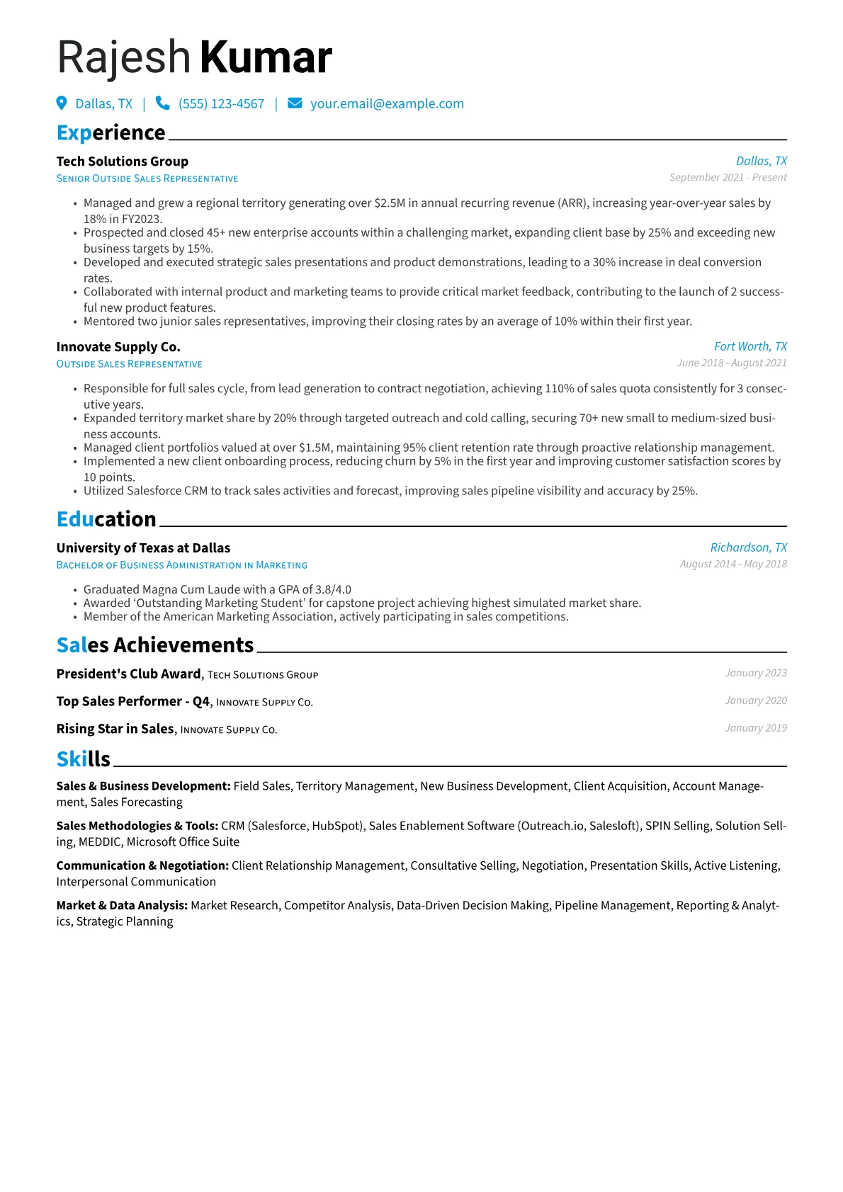 This exemplary template was built using JobSprout's intuitive CV builder. You can easily remix this structure and content to create your own compelling outside sales representative resume, tailored to your unique experience and career goals.