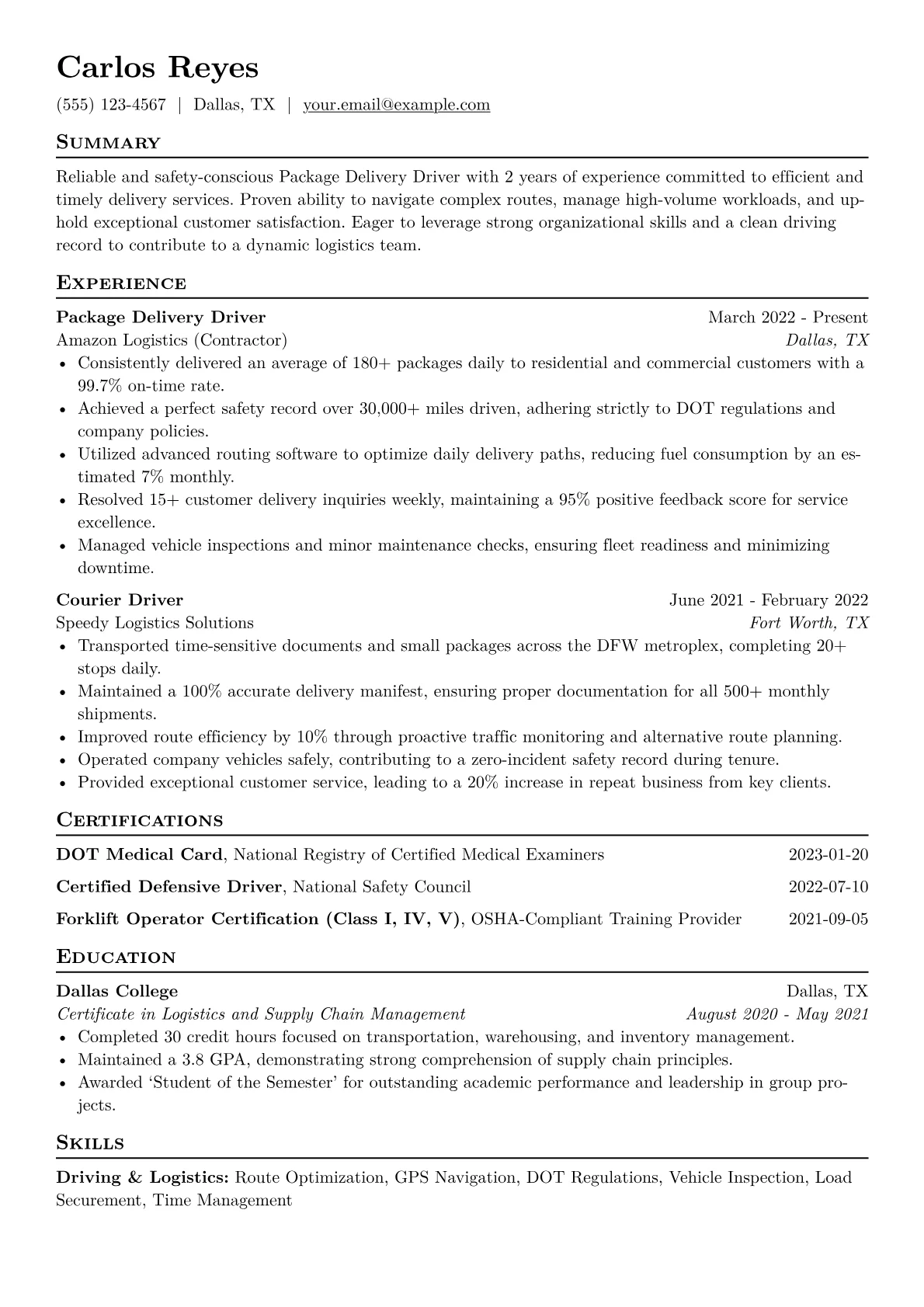 For entry-level Package Delivery Driver roles within the Operations sector, hiring managers prioritize candidates who demonstrate reliability, efficiency, and a commitment to safety. Key expectations include navigating complex routes, meeting strict delivery schedules, and handling packages carefully across varied conditions. A strong resume will highlight achievements such as consistent on-time delivery rates, maintaining a spotless driving record, and proficiency with route optimization software. Mentioning a valid driver's license, any DOT medical card if applicable, and experience with handheld scanning devices are crucial.