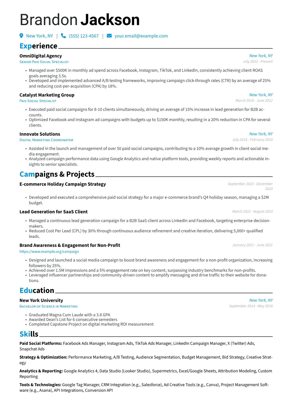 This robust template, designed with JobSprout, offers an excellent foundation which users can easily remix to tailor their own impressive Paid Social Specialist resume.
