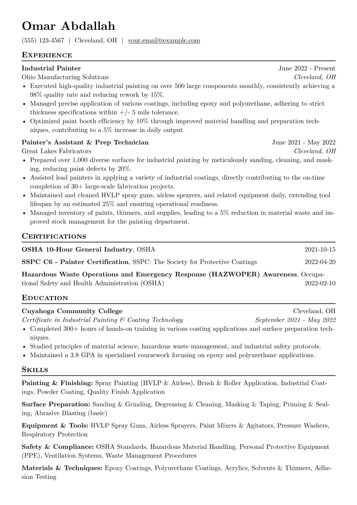 A strong entry-level Painter resume for the Manufacturing industry emphasizes precision, adherence to safety protocols, and knowledge of various finishing techniques. Hiring managers seek candidates who demonstrate meticulous attention to detail, efficiency in surface preparation and application, and a strong commitment to quality control and workplace safety. The unique challenges involve consistent quality across high volumes and navigating specific material handling and ventilation requirements.