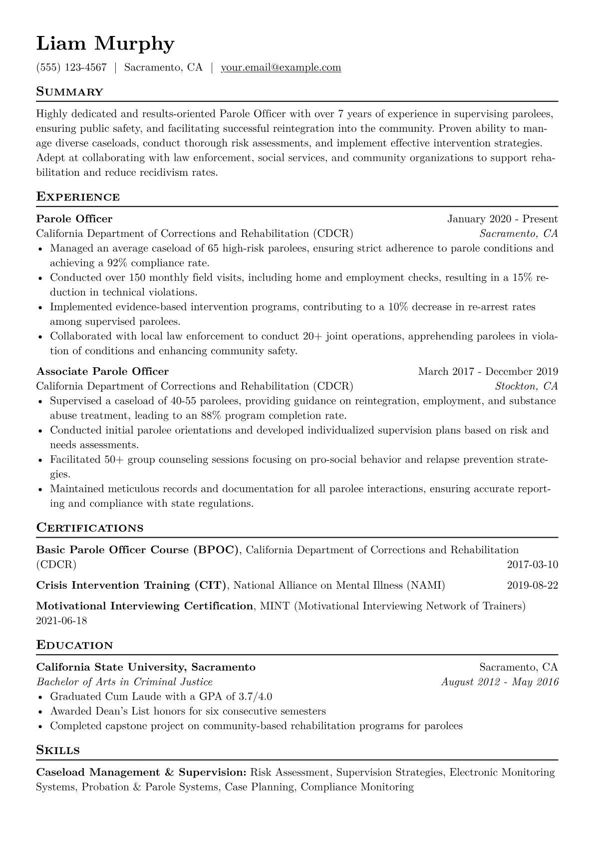 This example CV excels by structuring content to highlight these critical areas. Achievements are quantified, detailing successful caseload management and specific percentages of parolees maintaining compliance or employment. Skills are clearly grouped into categories like "Community Supervision & Risk Management," "Intervention & Rehabilitation," and "Legal Compliance." Crucially, specific certifications, specialized training in motivational interviewing, and experience with electronic monitoring technologies are prominently featured, offering a clear picture of a candidate's practical toolkit.