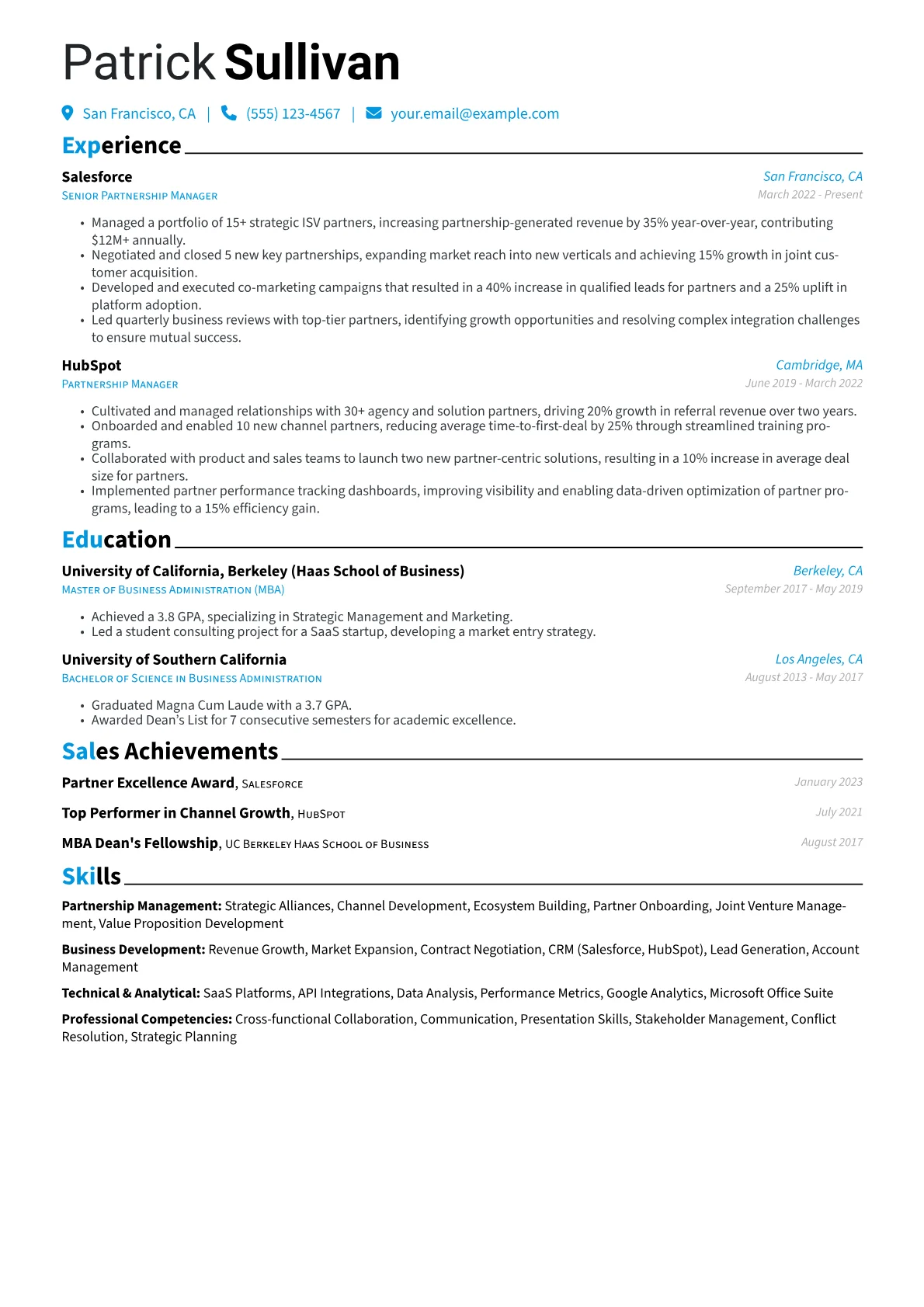 This example excels by incorporating highly quantified achievements, demonstrating tangible results like revenue growth and expanded partner networks. The resume also strategically groups relevant skills, making it easy for recruiters to quickly identify proficiencies in areas such as SaaS partnerships, channel development, and API integrations. Including industry-specific certifications further reinforces a candidate's expertise and commitment to professional development.