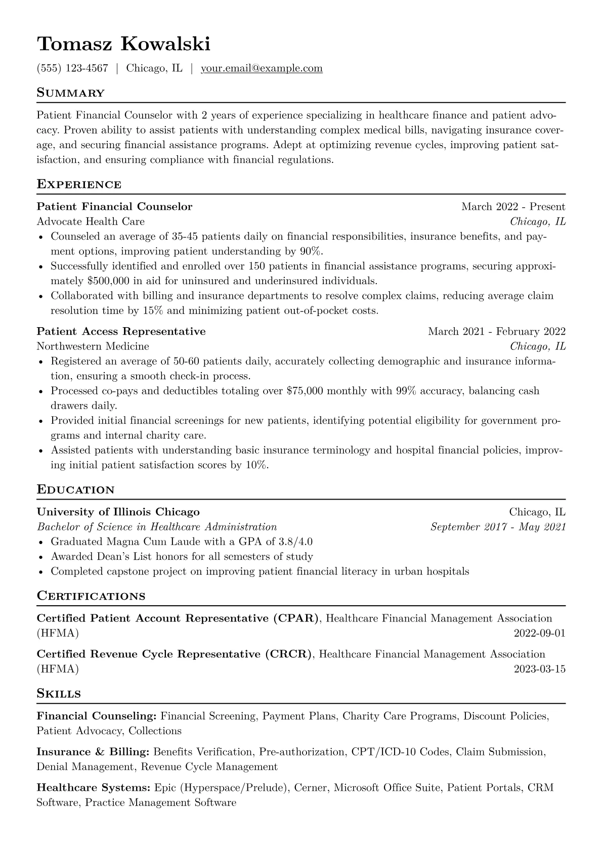 This template was built with JobSprout and can be remixed to create your own tailored Patient Financial Counselor resume, ensuring your qualifications stand out.