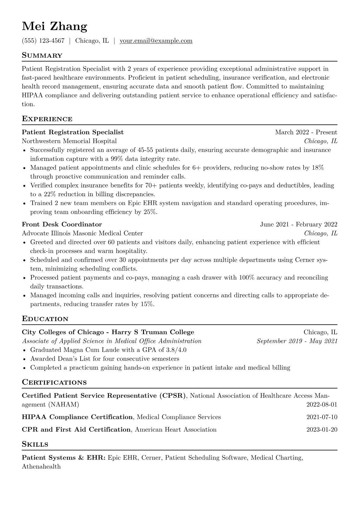 A compelling Patient Registration Specialist resume for an entry-level role emphasizes precision, patient interaction skills, and administrative aptitude. Hiring managers seek candidates who demonstrate an understanding of patient flow, data integrity, and compliance with privacy regulations like HIPAA. Key achievements to highlight include efficiency in processing patient information, maintaining appointment schedules, and handling insurance verification tasks. Relevant terminology such as EHR/EMR systems (e.g., Epic, Cerner), medical terminology, co-pays, and deductibles should be visible, showing readiness for healthcare environments. Certifications in medical administration or HIPAA compliance further strengthen a candidate's profile.