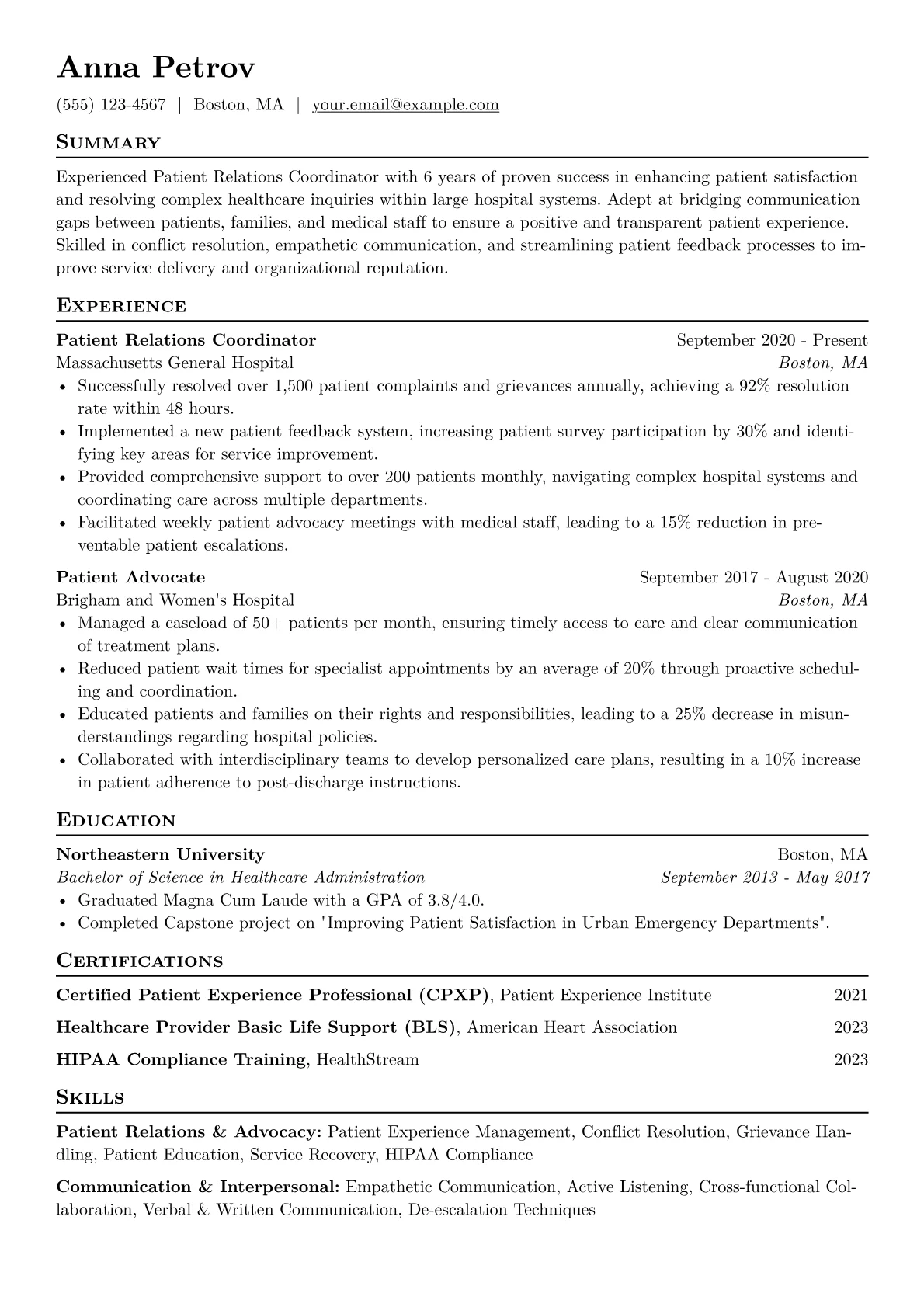 A compelling Patient Relations Coordinator resume in healthcare emphasizes a candidate's ability to navigate complex patient needs and uphold facility standards. Hiring managers seek clear evidence of conflict resolution, empathetic communication, and a proactive approach to patient advocacy within a clinical setting. This role demands proficiency in de-escalation techniques, a deep understanding of HIPAA regulations, and the capacity to improve patient experience metrics. Strong resumes often detail achievements like reducing complaint resolution times, enhancing patient satisfaction scores by specific percentages, or successfully mediating challenging situations. Specific certifications such as CPXP (Certified Patient Experience Professional) or expertise with EMR systems like Epic or Cerner are highly valued.