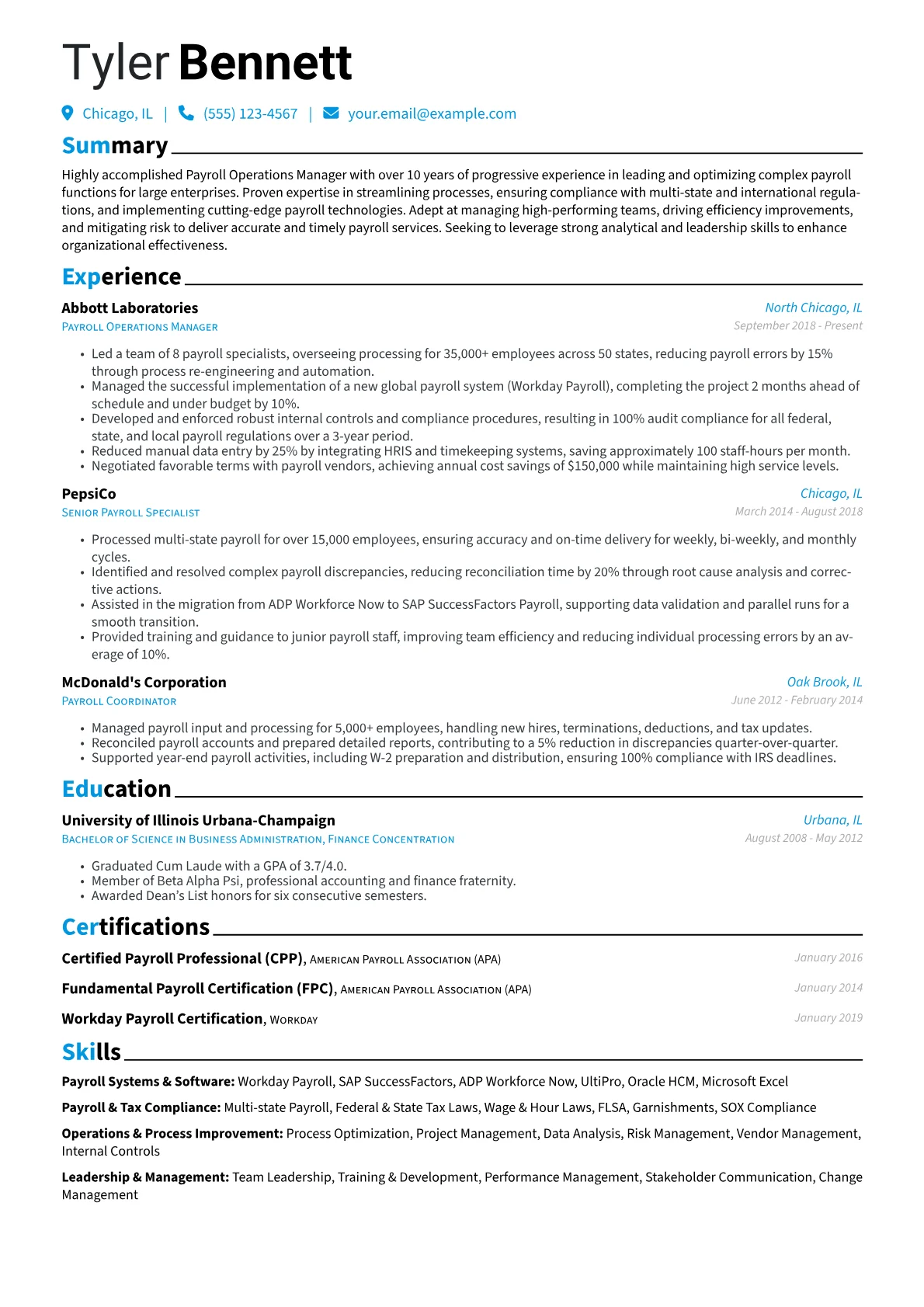 This example resume effectively highlights these crucial elements. It quantifies achievements, such as "reduced processing time by 15% through system optimization," rather than simply listing duties. Skills are clearly grouped, separating "Payroll Systems Proficiency" from "Compliance and Reporting," which immediately showcases a broad skill set. Prominent placement of the CPP certification and specific payroll software proficiencies further reinforces the candidate's technical and regulatory expertise, demonstrating a strategic grasp of payroll operations.