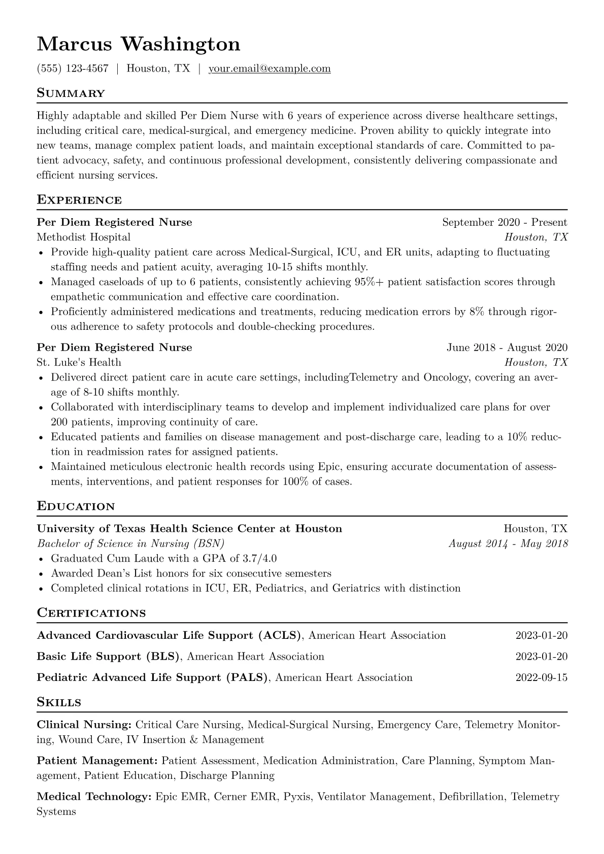 This template was built with JobSprout and can be remixed to create your own tailored Per Diem Nurse resume.