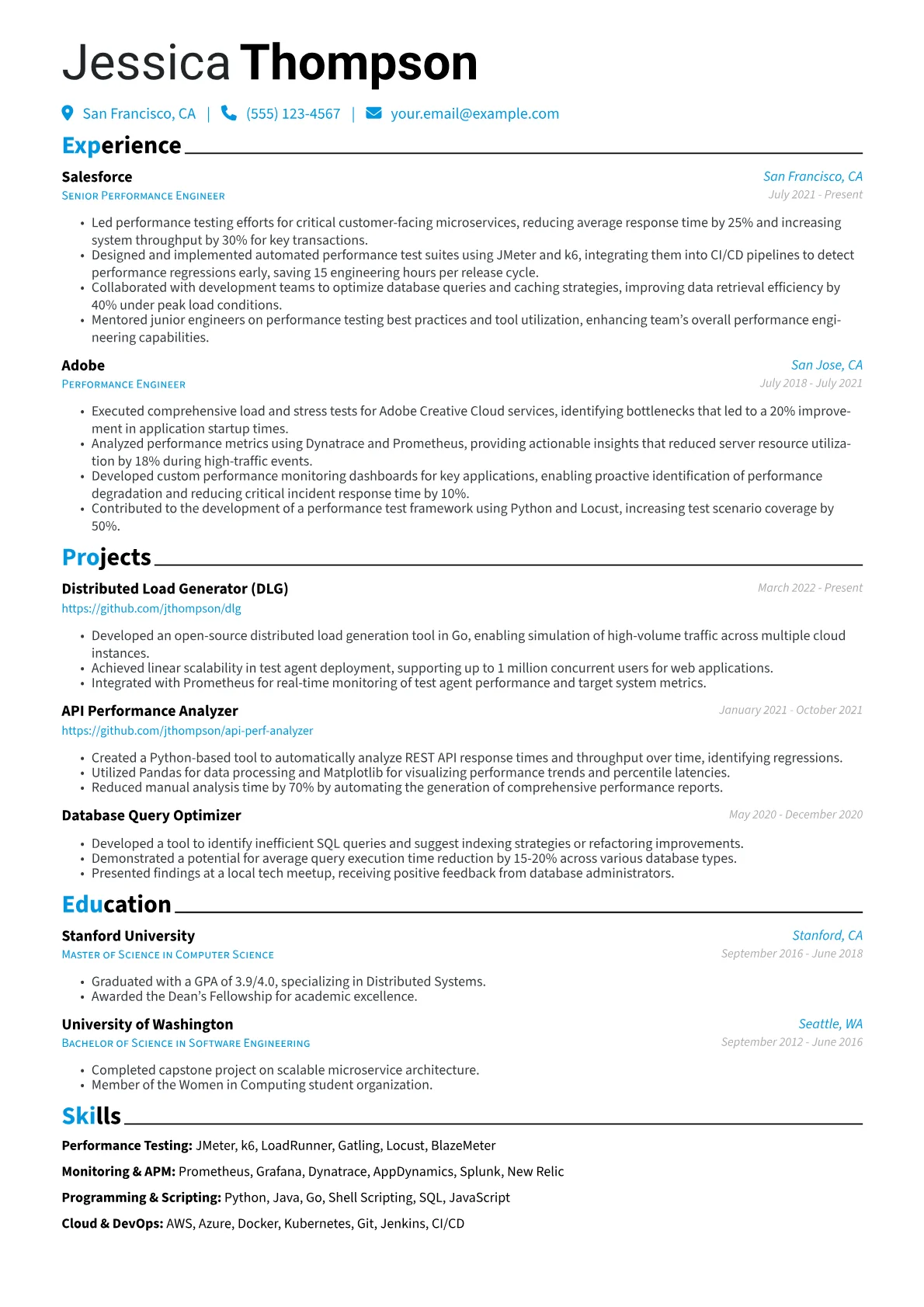 This JobSprout example excels by prominently featuring quantified achievements, such as specific percentage reductions in latency or improvements in throughput, directly within each role description. It effectively groups technical skills, highlighting proficiency with critical performance tools and methodologies. This structure immediately conveys the candidate's practical experience and tangible contributions.
