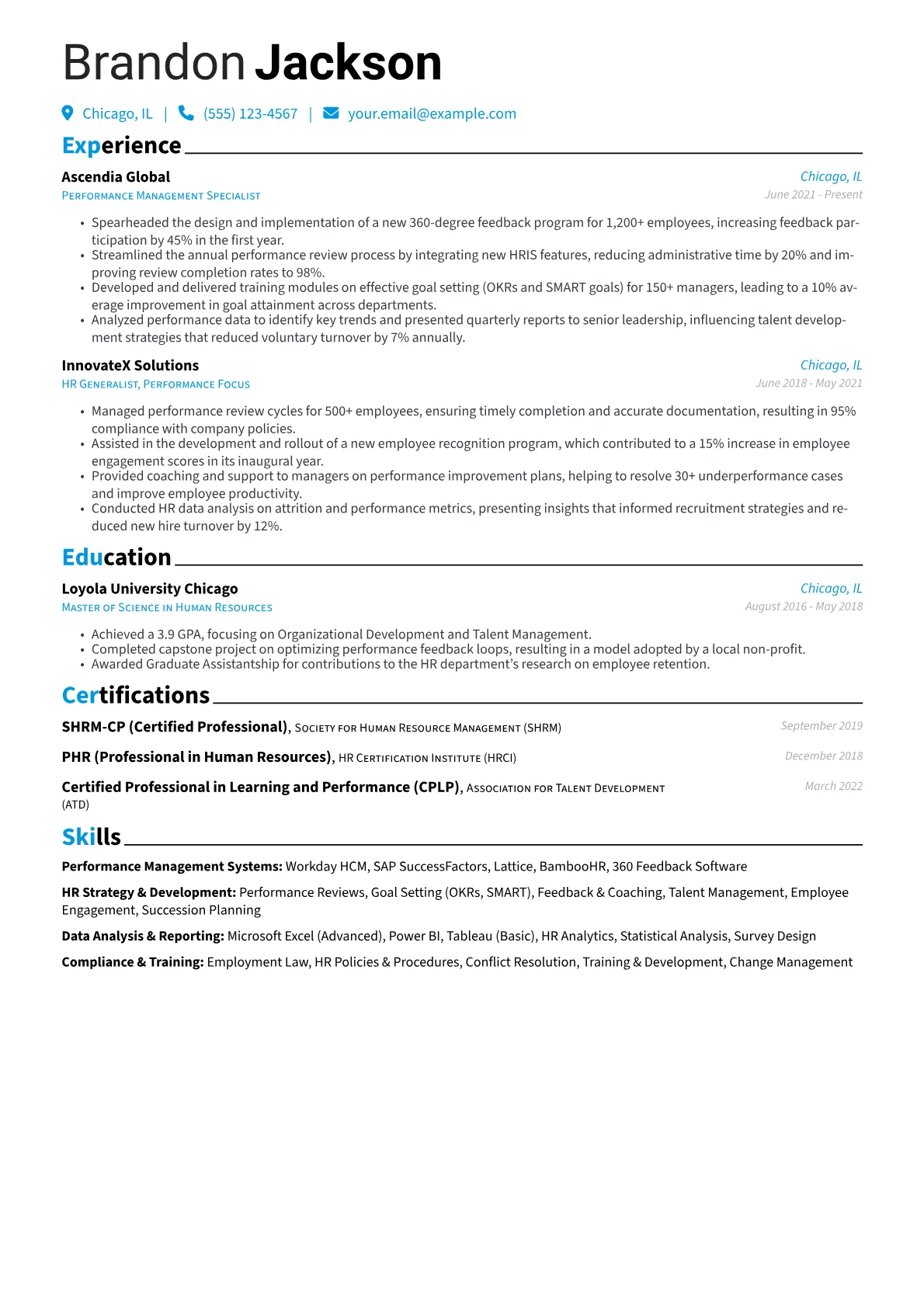 This example excels by featuring clear, quantified achievements, illustrating tangible results like improved employee engagement or increased goal attainment. Its well-organized skills section thoughtfully groups proficiencies such as HRIS platforms, data analysis, and coaching, highlighting a comprehensive toolkit. The inclusion of relevant HR certifications further solidifies its professional credibility.