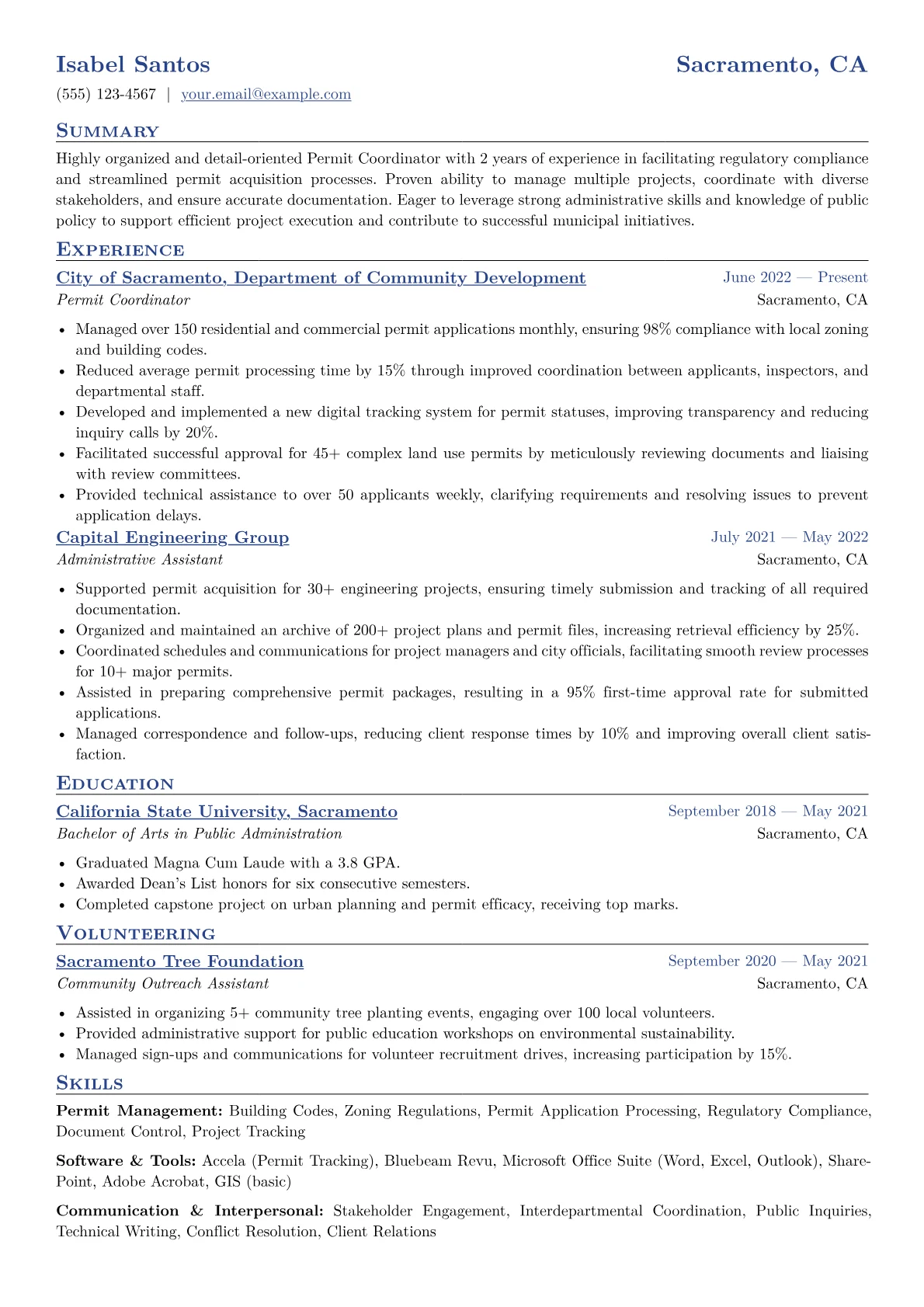For an entry-level Permit Coordinator in government, hiring managers prioritize meticulous organizational skills and an understanding of regulatory frameworks. They seek candidates who can demonstrate precision in processing applications, maintaining detailed records, and communicating complex requirements clearly to the public. Highlighting experience with specific permit types, such as zoning variances or building permits, is crucial. Mentioning familiarity with local ordinances, state regulations, or permit tracking software like Accela or EnerGov truly stands out. Achievements should focus on accuracy in data entry, efficient document management, and effective coordination with planning or inspections departments, even in volunteer or internship roles.