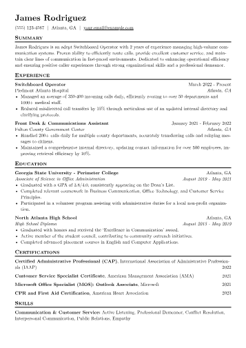 This example resume effectively showcases these essential qualities. Its clear "Skills" section groups relevant technical abilities like permit software proficiency and public records management, alongside communication skills vital for applicant interaction. Quantified achievements, even from limited experience, highlight contributions such as processing a specific volume of applications or maintaining compliance rates. Certifications in relevant areas, or any training in public service communication, are strategically placed to draw attention to professional development aligned with government expectations.