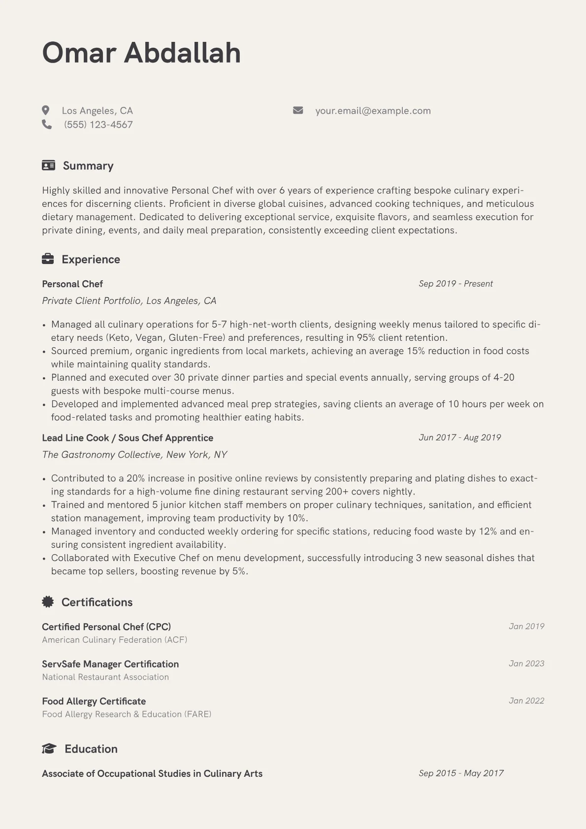 For a mid-level Personal Chef, a compelling resume showcases not just culinary prowess but also client-centric service and operational acumen. Hiring managers prioritize adaptability to diverse palates and dietary needs, strong organizational skills for menu planning and inventory, and discreet professionalism. Achievements should highlight successful client retention, specific dietary accommodations (e.g., paleo, FODMAP), and examples of managing budgets or sourcing unique ingredients. Relevant certifications like a ServSafe Food Manager credential are essential, alongside experience in allergen management and bespoke meal creation.