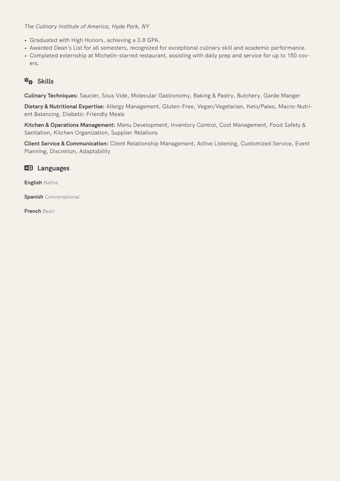 This template was built with JobSprout and can be remixed to create your own tailored Personal Chef resume. Ensure you present a professional and compelling profile to potential clients.