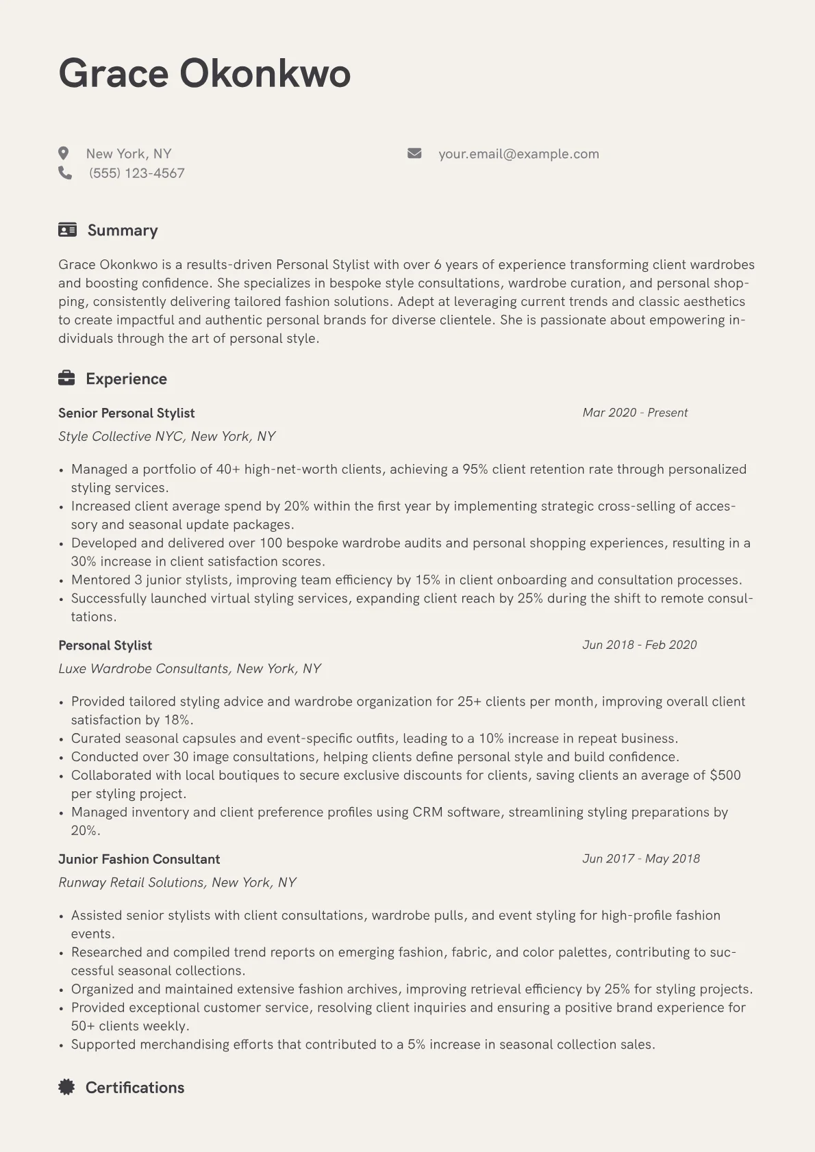 This template, built with JobSprout, provides a robust framework that can be easily customized to create your own compelling Personal Stylist resume.