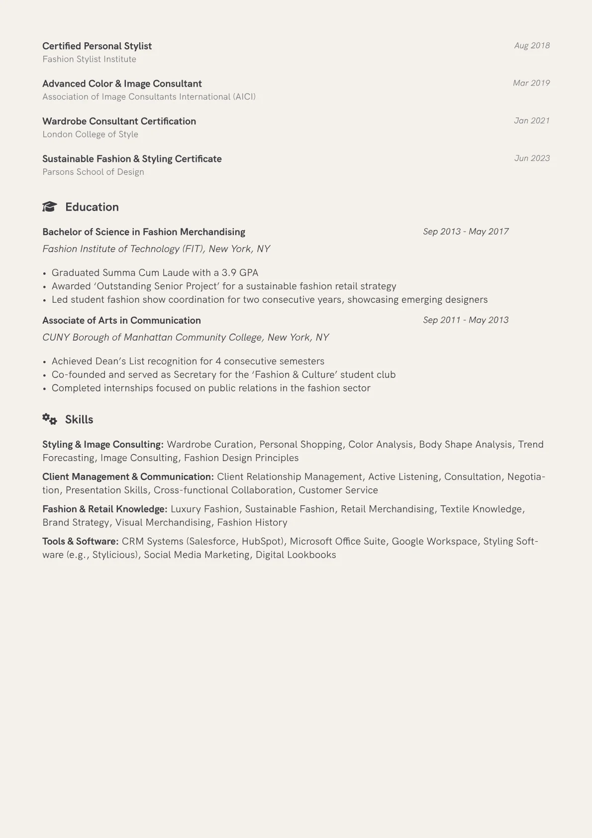 This JobSprout example effectively highlights these elements by precisely quantifying stylistic achievements, such as "increased client confidence by 25% through tailored wardrobe overhauls." Key skills are strategically grouped, separating "Client Relations" from "Styling & Design," while specific tools like CRM platforms for client management and portfolio links for visual evidence are prominently featured. The resume also emphasizes experience in bespoke wardrobe curation and personal brand alignment, directly addressing nuanced expectations for stylists in unique contexts.