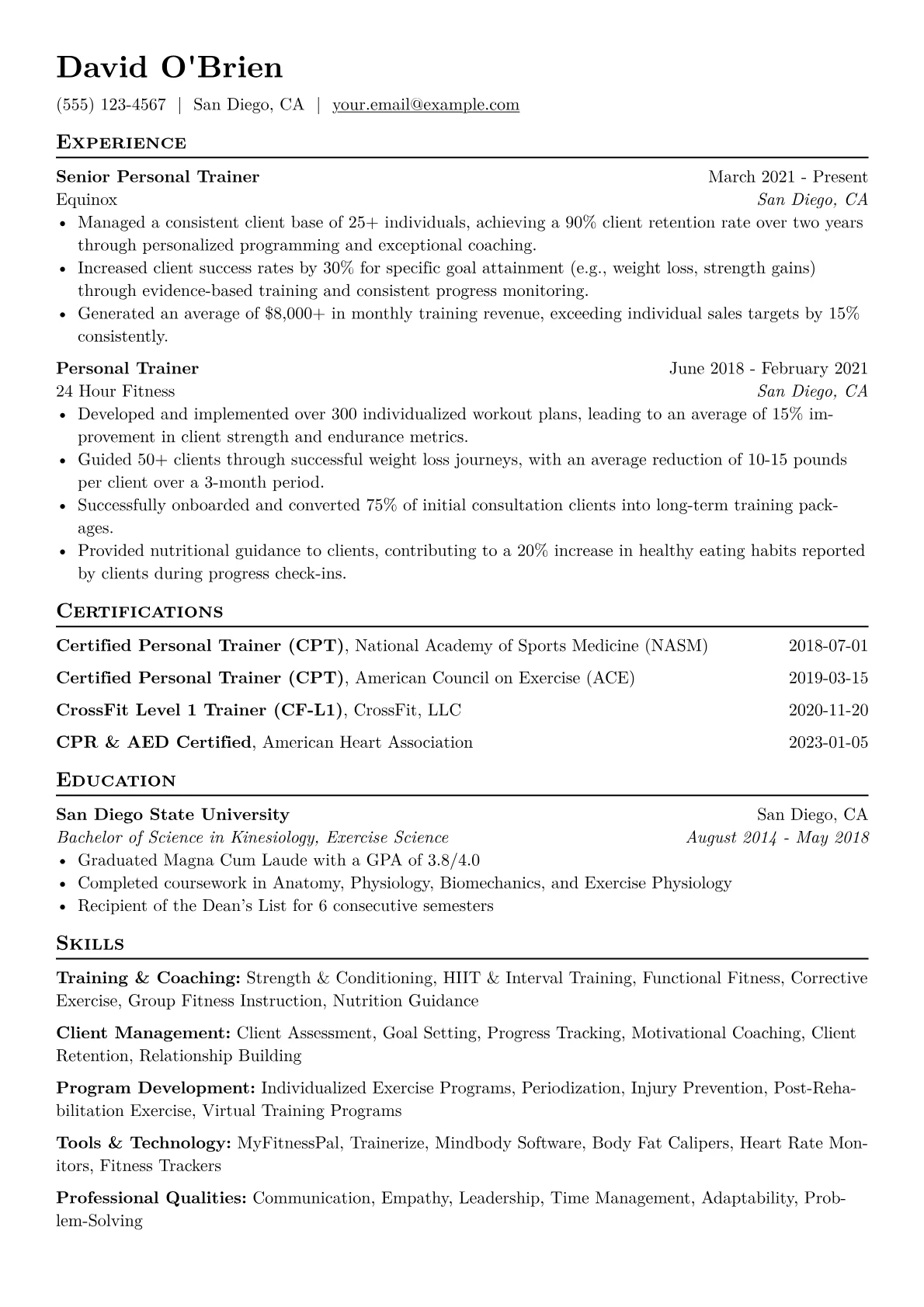 This resume example excels by strategically presenting quantified achievements that go beyond daily tasks, such as "increased client retention by 20%" or "guided 30+ clients to achieve specific fitness goals." It prominently features relevant certifications like NASM and ACE, ensuring immediate credibility. The clear skills grouping, separating areas like "Strength & Conditioning," "Nutritional Guidance," and "Client Relations," allows hiring managers to quickly identify key competencies.