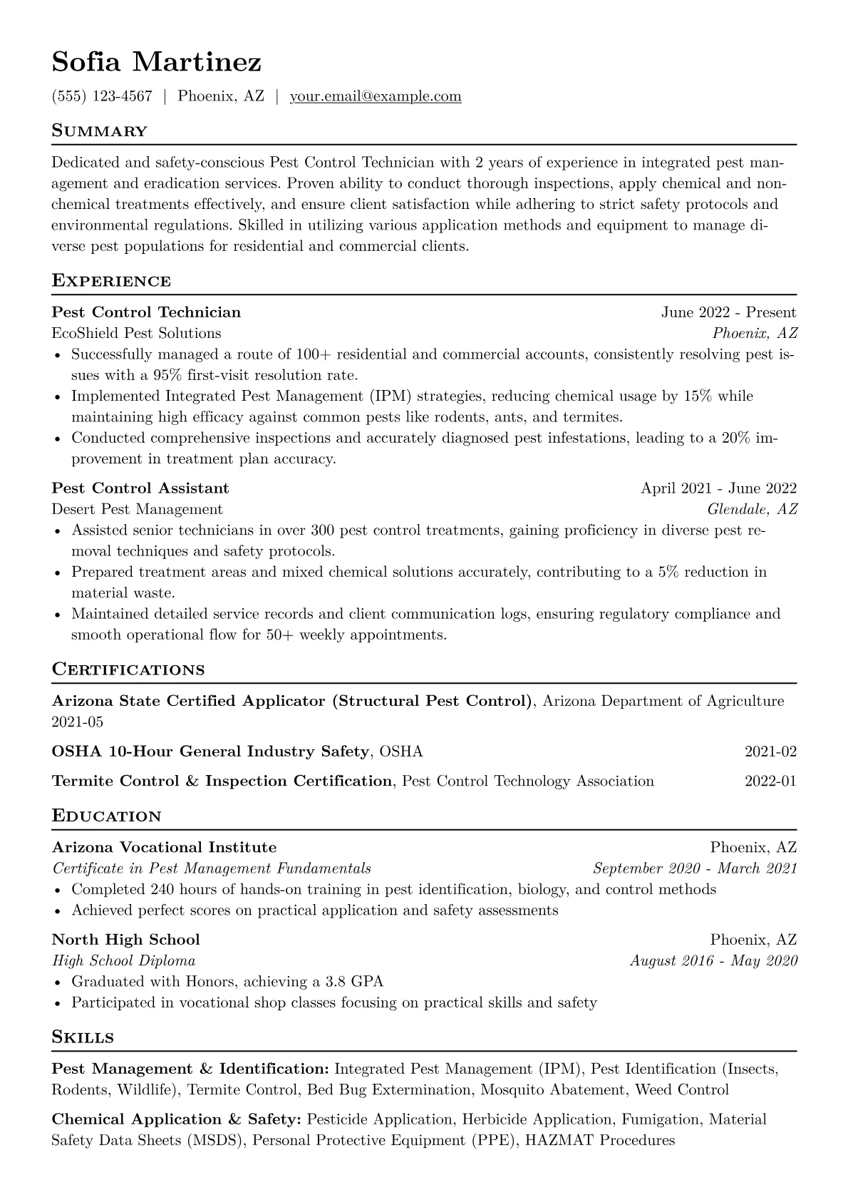 This example CV excels by clearly segmenting its content. It features a dedicated "Certifications and Licenses" section, immediately highlighting the candidate’s official qualifications, such as a state Pesticide Applicator License or OSHA certifications. The "Skills" section is well-grouped, separating technical proficiencies like "Pest Identification," "Chemical Application," and "Equipment Operation" from soft skills. Furthermore, the resume effectively quantifies achievements, even for limited experience, by referencing specific numbers of inspections performed or types of pest issues addressed, providing tangible evidence of capability.
