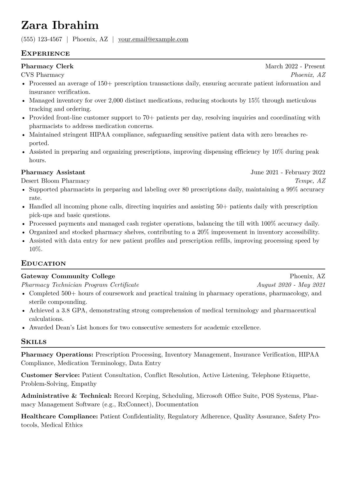 A strong Pharmacy Clerk resume for the Retail & E-commerce sector emphasizes meticulous attention to detail, exceptional customer service, and efficient organizational skills. Hiring managers seek candidates who can accurately process transactions, manage inventory, and provide compassionate support to patients while navigating the fast-paced and sensitive environment of a pharmacy. Understanding basic medical terminology and HIPAA compliance is also highly valued.