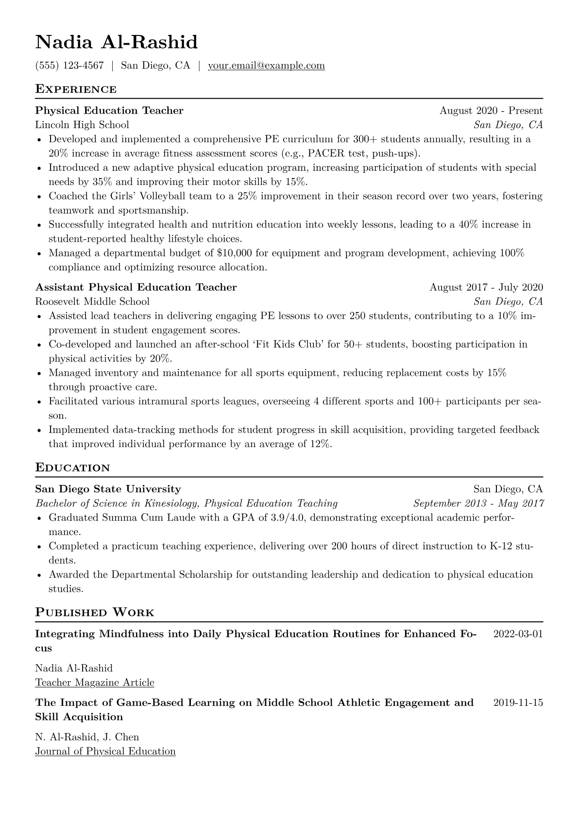 This example excels by prioritizing quantified achievements, such as increasing participation rates or implementing new wellness programs, providing concrete evidence of impact. It strategically groups relevant certifications like CPR/First Aid alongside specialized skills in diverse sports and adaptive PE, highlighting a comprehensive professional toolkit. The clear structure effectively communicates both teaching expertise and practical leadership experience, appealing to busy hiring managers.