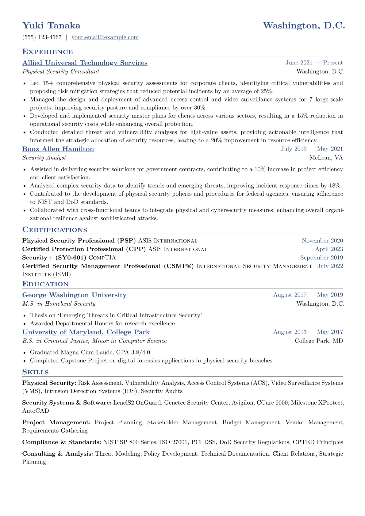 This effective template was built with JobSprout and can be remixed to create your own tailored physical security consultant resume.