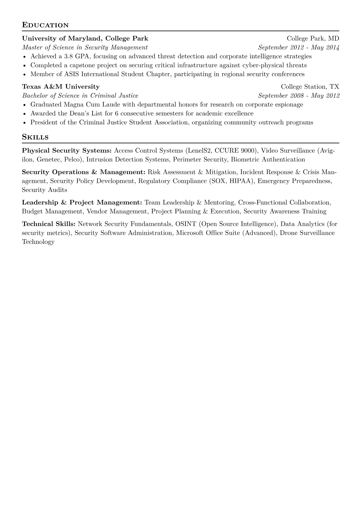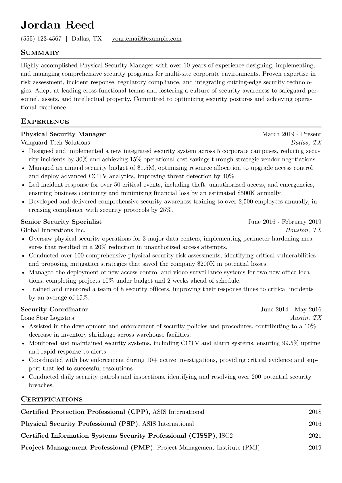 This template was built with JobSprout and can be remixed to create your own tailored Physical Security Manager resume. Its clear, results-oriented format provides an excellent foundation for showcasing your unique expertise.