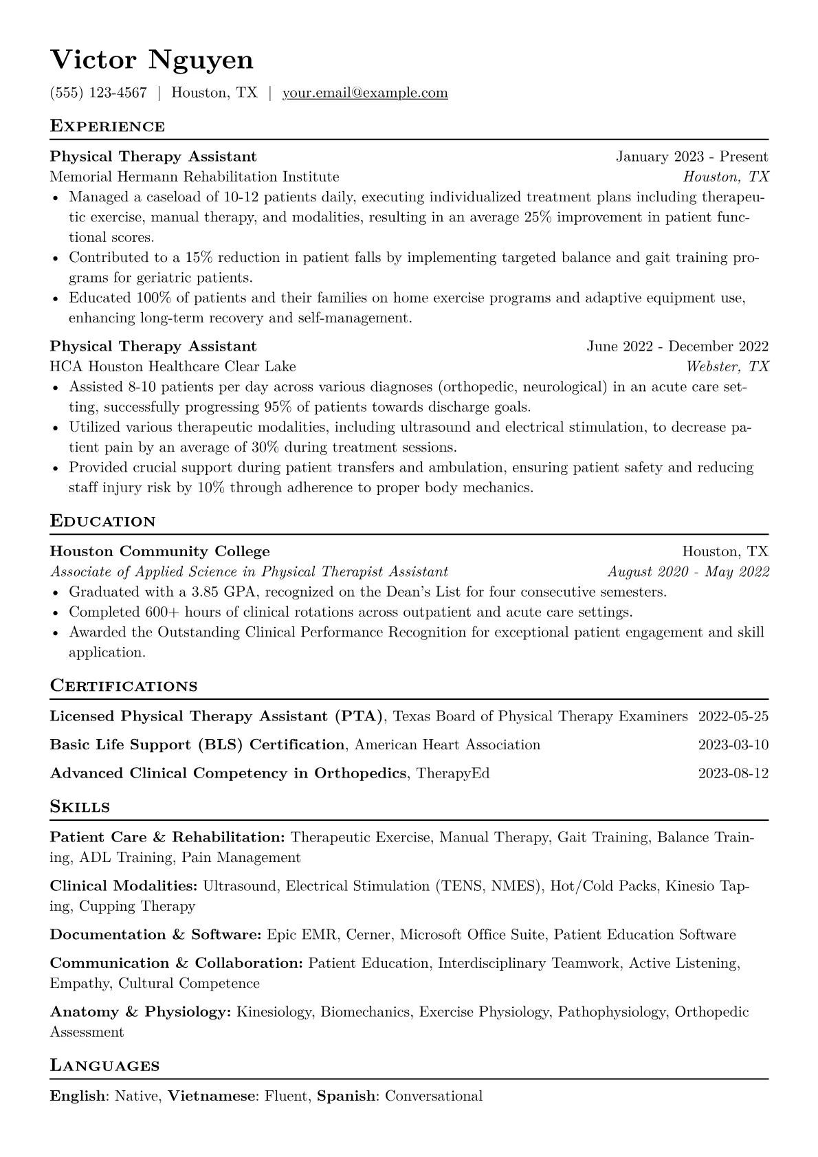 This JobSprout example excels by prominently featuring quantifiable achievements from clinical experiences, such as assisting a specific number of patients or contributing to measurable patient progress. It also strategically groups essential skills, differentiating between technical proficiencies like therapeutic modalities and vital soft skills like patient education. Furthermore, the resume clearly lists all relevant certifications, including the PTA license and BLS, ensuring quick recognition by recruiters.