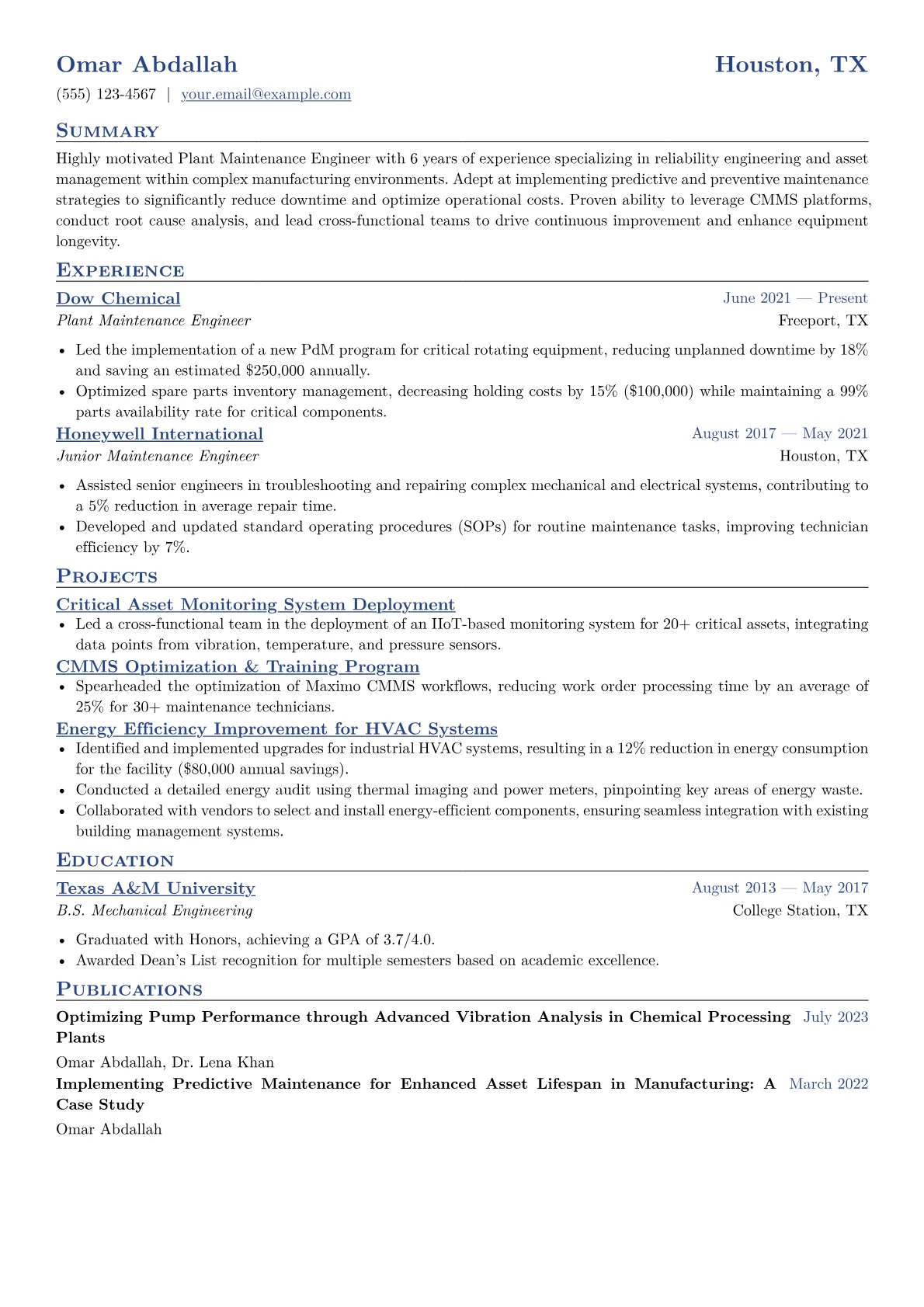 A strong Plant Maintenance Engineer resume in manufacturing focuses on tangible contributions to operational uptime and efficiency. Hiring managers seek evidence of reducing downtime, optimizing equipment performance, and extending asset lifecycles. They value experience with Total Productive Maintenance (TPM) methodologies, Computerized Maintenance Management Systems (CMMS), and Root Cause Analysis. Specific achievements might include improving Overall Equipment Effectiveness (OEE) or reducing Mean Time To Repair (MTTR), while certifications like CMRP or expertise in PLC programming (Siemens, Allen-Bradley) and precision tooling are highly sought after, reflecting a proactive approach to maintaining complex machinery and adhering to safety protocols.